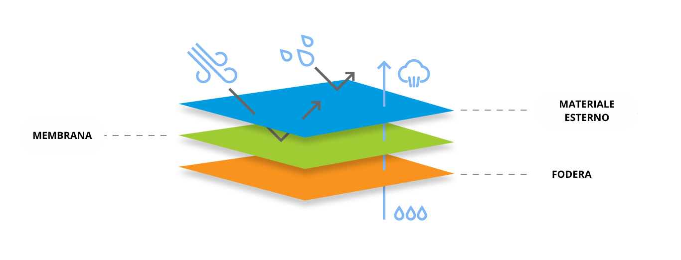 1. Softshell con membrana – tra lo strato esterno e la fodera è laminata una membrana che offre una migliore resistenza al vento e all’umidità esterna.