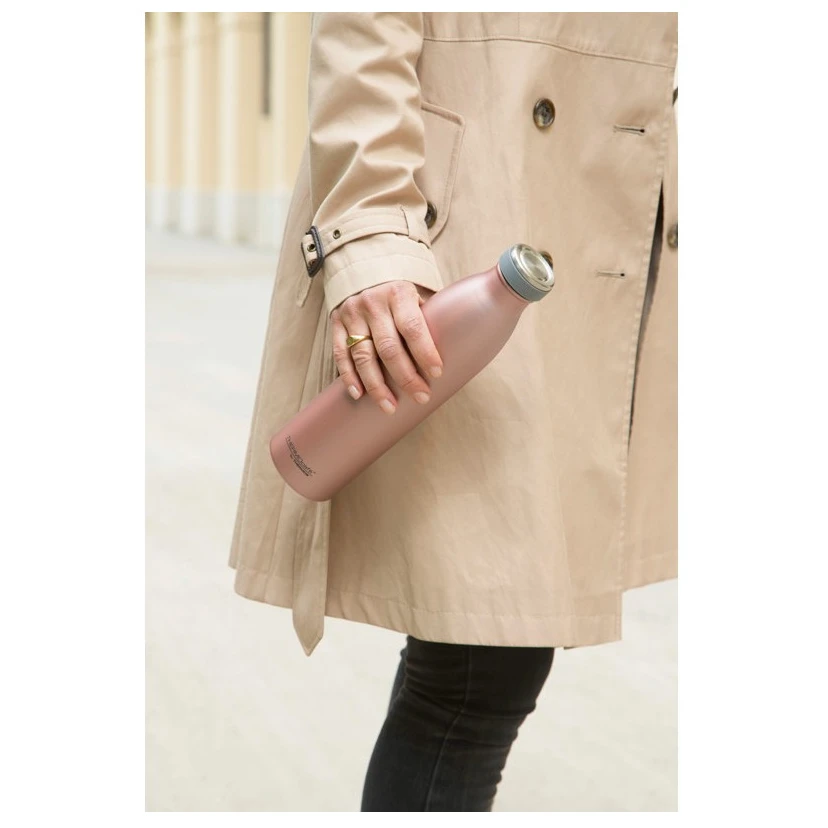 La bottiglia è dotata di un tappo a vite con corpo in acciaio inossidabile, completato da un anello in silicone antiscivolo. Questo garantisce una presa sicura durante l'apertura e la chiusura, anche con le mani bagnate. Il collo stretto con un diametro di 3,3 cm, insieme all'isolamento sottovuoto di alta qualità, riduce la dispersione di calore durante il consumo e contribuisce a ottime proprietà isolanti.