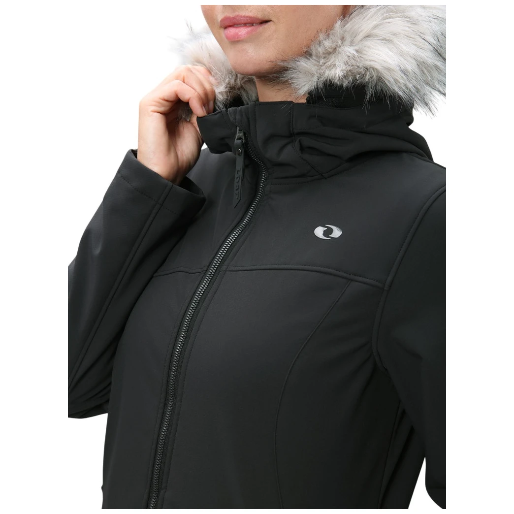 Il cappotto softshell da donna Loap Lustra con membrana Aqua Pro (5.000 mm / 5.000 g/m²/24 h) unisce funzionalità e stile elegante.