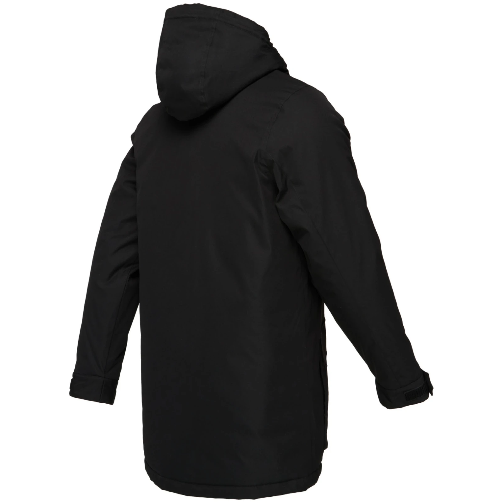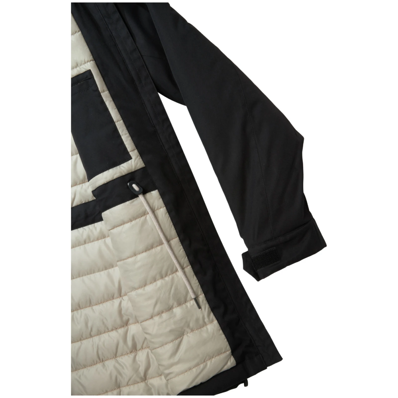 Il taglio classico del cappotto con coulisse in vita consente di adattarlo al proprio stile, mentre le maniche possono essere facilmente regolate con il velcro. Il cappuccio fisso regolabilee la cerniera ossea a due vie con effetto metallizzato conferiscono al cappotto un look moderno e ne aumentano la funzionalità.