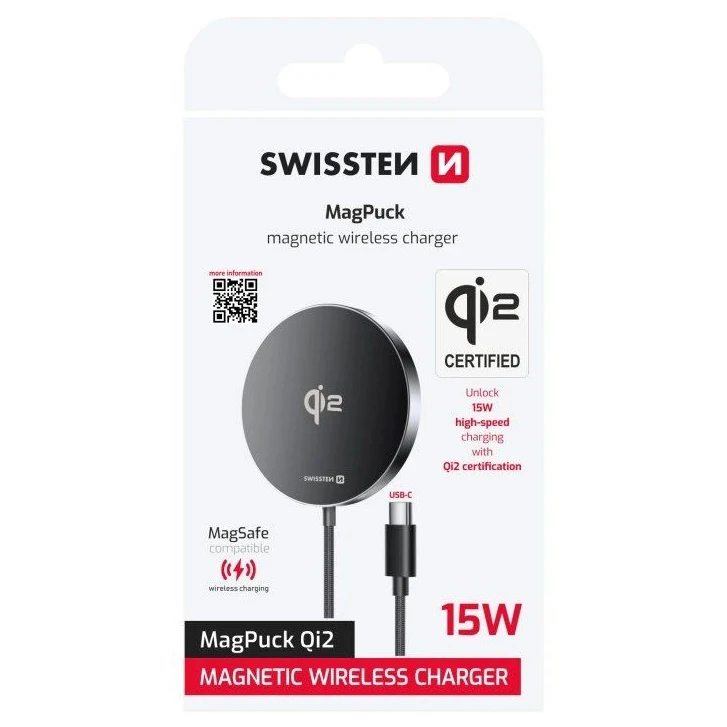 Caricabatterie wireless Swissten MagPuck porta un nuovo standard di comodità e prestazioni grazie al supporto Qi2. Carica alla velocità di 15 W, garantendo massima efficienza e perdite minime di energia. È compatibile con iPhone dal modello 12 in su, serie Samsung S23-S25 e altri dispositivi che supportano lo standard Qi2.