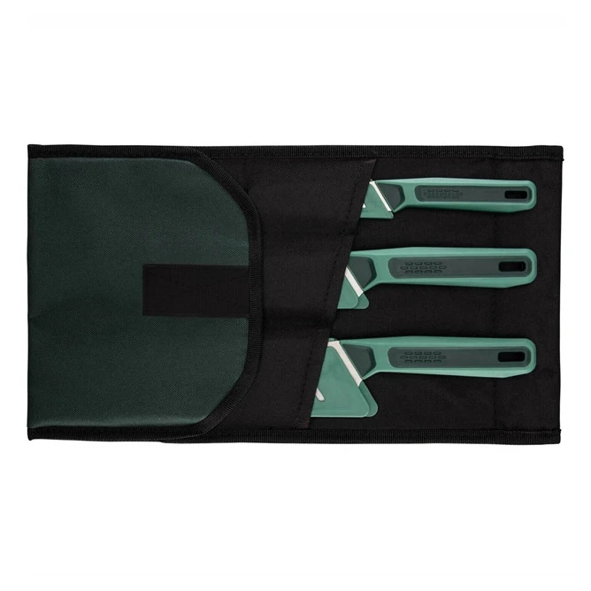 Il set include un grande coltello da cucina con lama liscia da 8" (203 mm), un coltello medio con lama seghettata da 6" (152 mm) e un piccolo coltello con lama liscia da 3,25" (83 mm). Ogni coltello è dotato di una protezione per la lama e tutti e tre si adattano alla resistente custodia in poliestere inclusa nella confezione.
