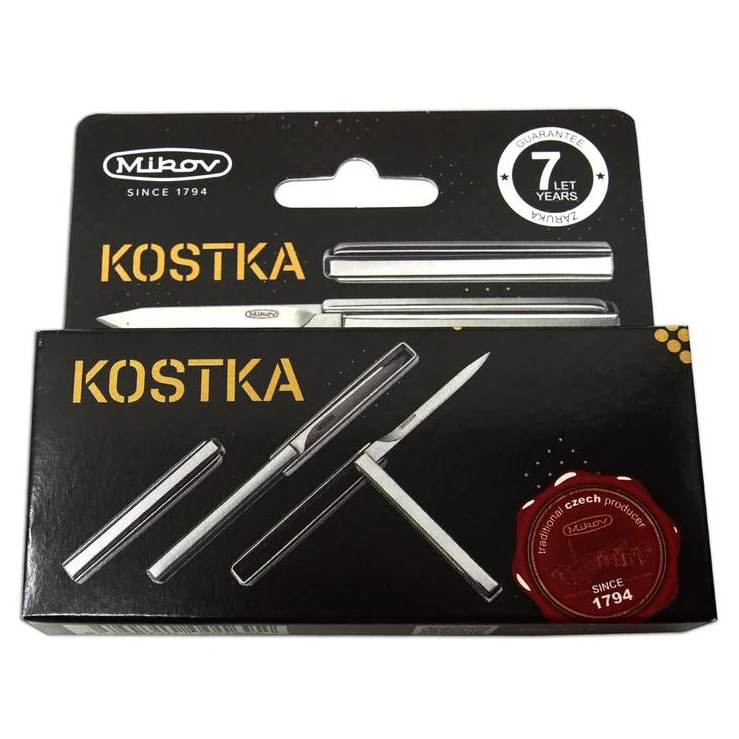 Il coltello Mikov Kostka è la dimostrazione che anche un piccolo coltello tascabile può essere elegante, pratico e al contempo originale. La sua forma squadrata, da chiuso, ricorda un cubo, da cui il nome. Ciò che colpisce, tuttavia, è soprattutto il modo non convenzionale di aprirlo: ribaltando due volte le guancette in acciaio inossidabile di 180 gradi si ottiene un coltello completo pronto all'uso.