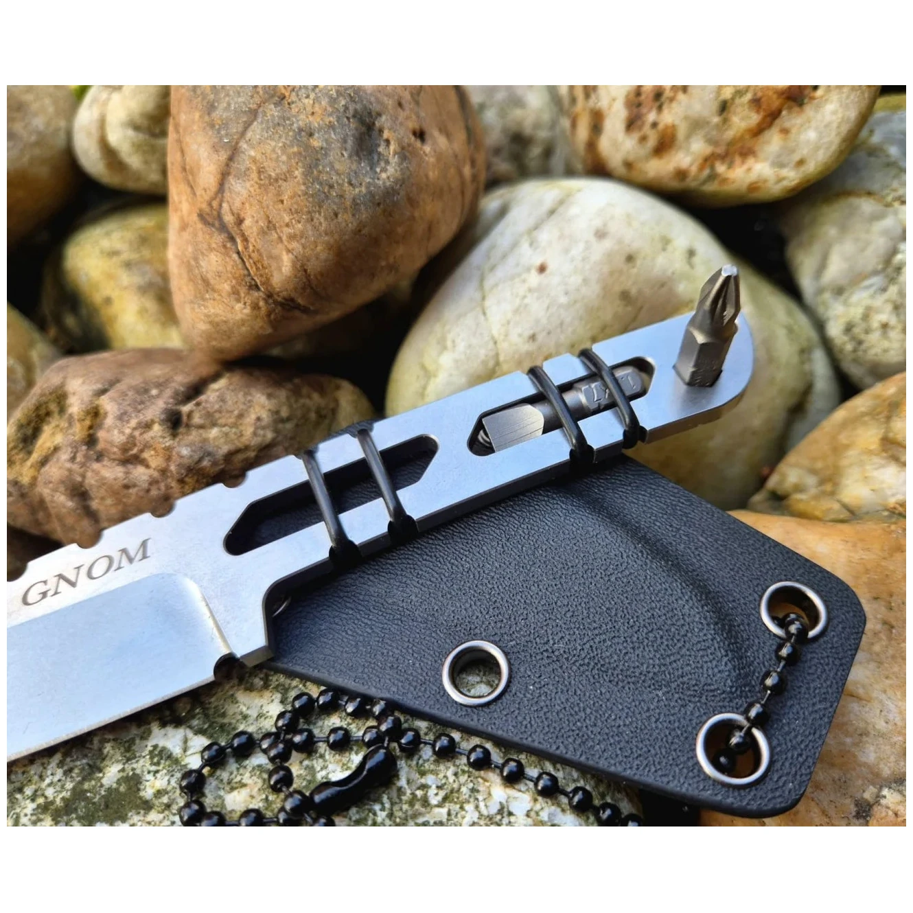 La lama in acciaio inossidabile N690 con durezza 59 HRC garantisce una straordinaria affilatura, un'elevata resistenza alla corrosione e una lunga durata. Grazie alla pratica custodia Kydex con possibilità di essere indossato al collo, hai Gnom sempre a portata di mano, pronto all'uso in un istante.