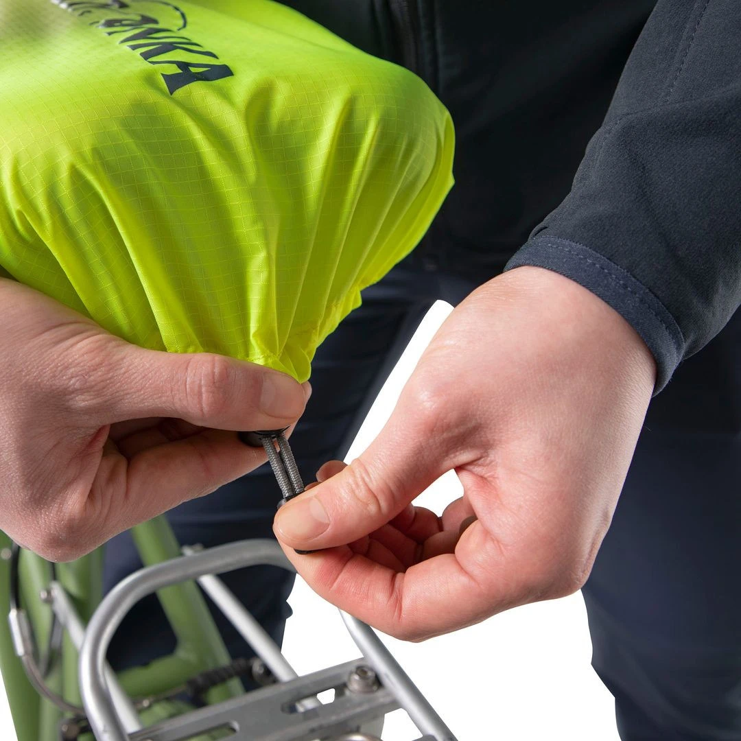 La copertura è facile da montare grazie all'elastico con coulisse che garantisce una presa salda. Per una migliore visibilità in condizioni di scarsa illuminazione, è dotato di una superficie riflettente. Dopo l'uso, la fodera può essere ripiegata in una pratica custodia integrata, in modo da poterla riporre comodamente in una tasca o nello zaino. Un accessorio leggero, compatto ed ecologico che ogni ciclista apprezzerà.