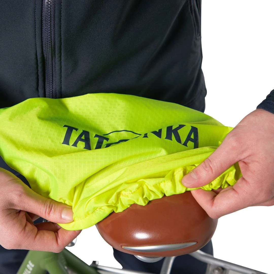 Coprisella impermeabile per sella da bici Tatonka Saddle Cover realizzata in poliestere riciclato con superficie riflettente e trattamento senza PFC/PFAS.