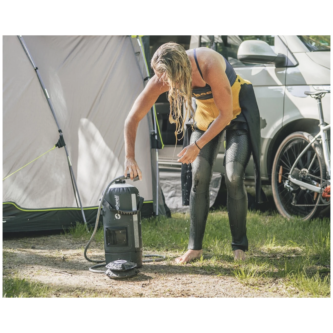 Doccia da campeggio manuale Outwell Seabreeze Pressure Shower è adatta per l'uso in giardino, in campeggio o in viaggio. Puoi usarla per farti la doccia, lavare il cane o sciacquare mute o attrezzatura da campeggio.