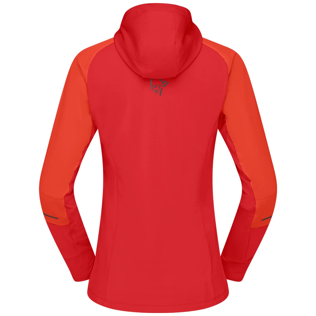 Norrona senja Alpha90 Hood è una felpa tecnica da donna ibrida progettata per la corsa e altre attività intense all'aperto. Combina una parziale protezione dal vento nella parte anteriore con un' elevata traspirabilità nella parte posteriore, contribuendo a mantenere il comfort termico durante gli spostamenti.