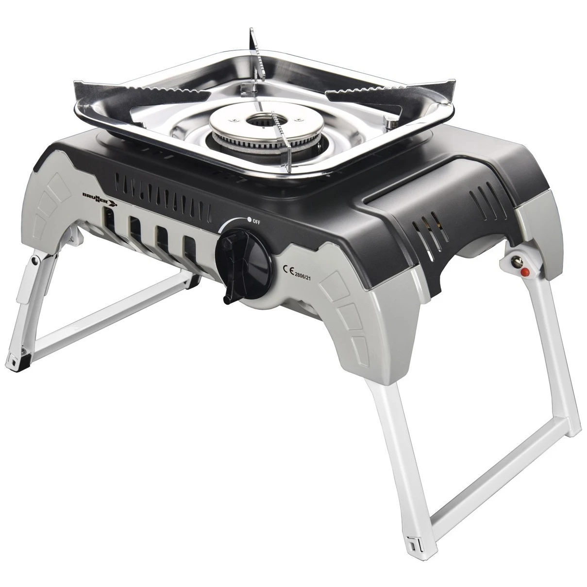 Il fornello a gas compatto Devil 450 del marchio Brunner, ideale per cucinare, si chiude e si trasporta facilmente grazie alle pratiche gambe pieghevoli. Include una griglia di supporto in acciaio inossidabile per la stabilità di pentole o padelle con un diametro da 12 a 26 cm. Ideale per le vacanze o le gite.