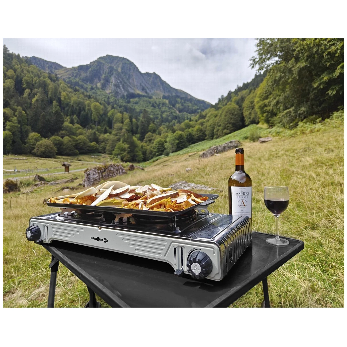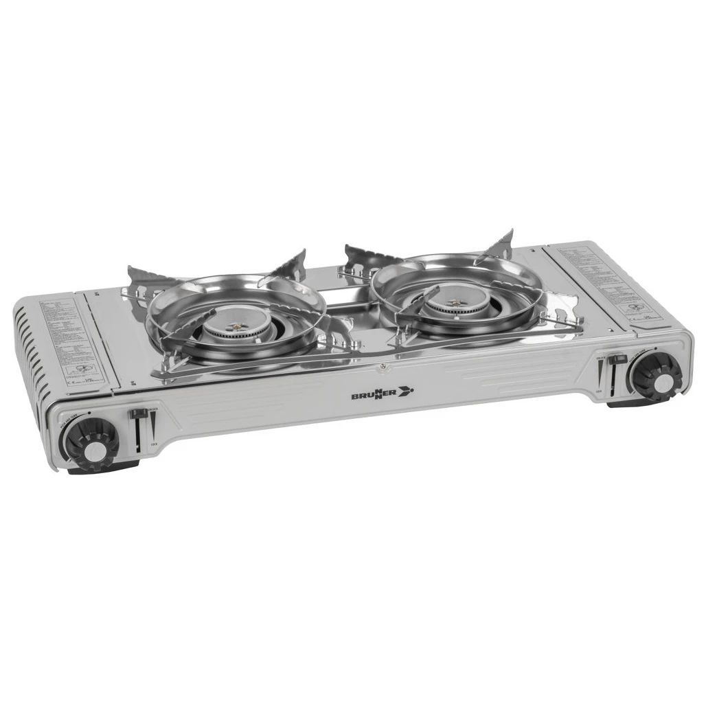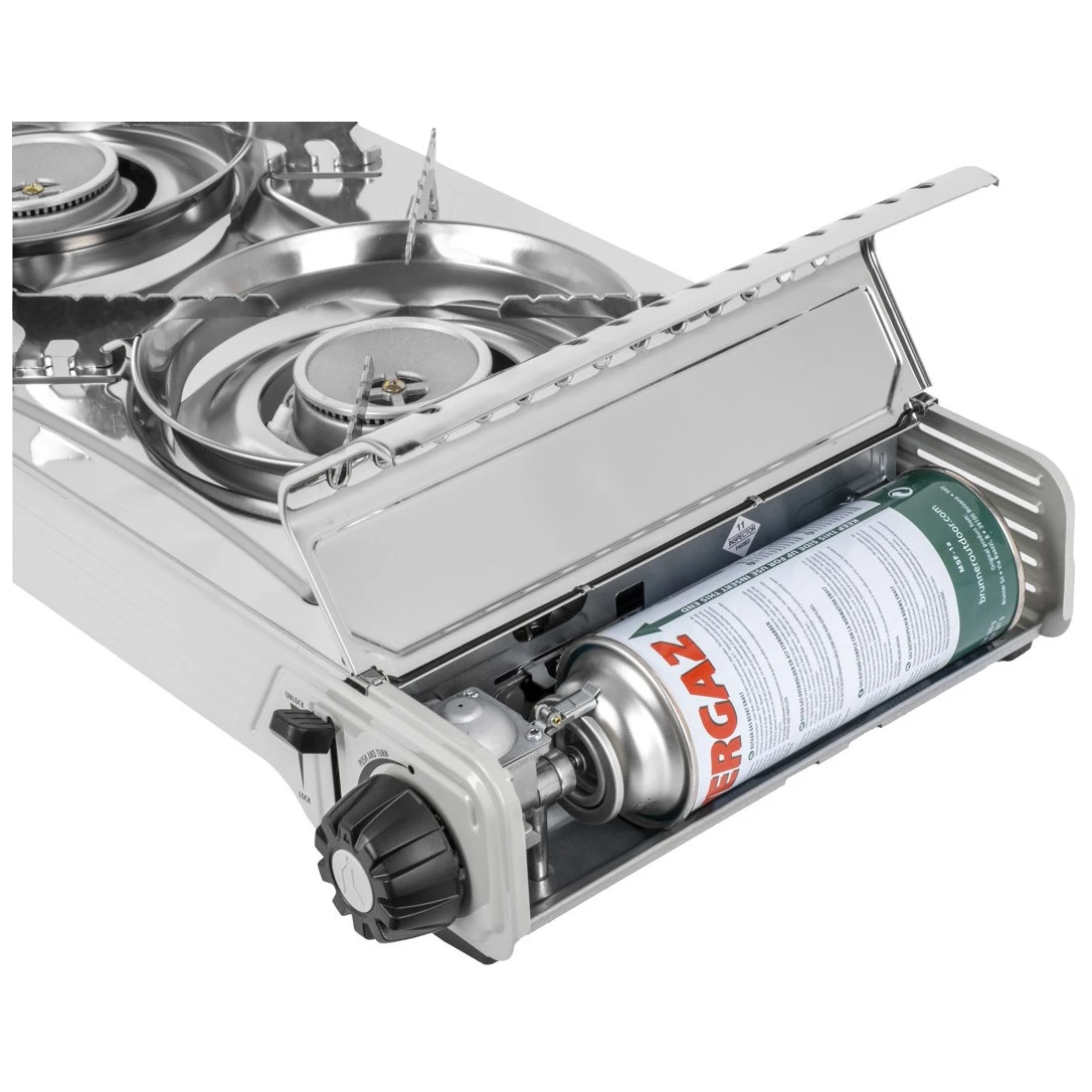 Fornello a gas con 2 bruciatori e piastra grill Devil Double Grill del marchio Brunner, ideale per cucinare e facile da trasportare. Include una griglia di supporto in acciaio inox per la stabilità di pentole o padelle e una piastra grill in alluminio pressofuso con una superficie liscia e rigata antiaderente.