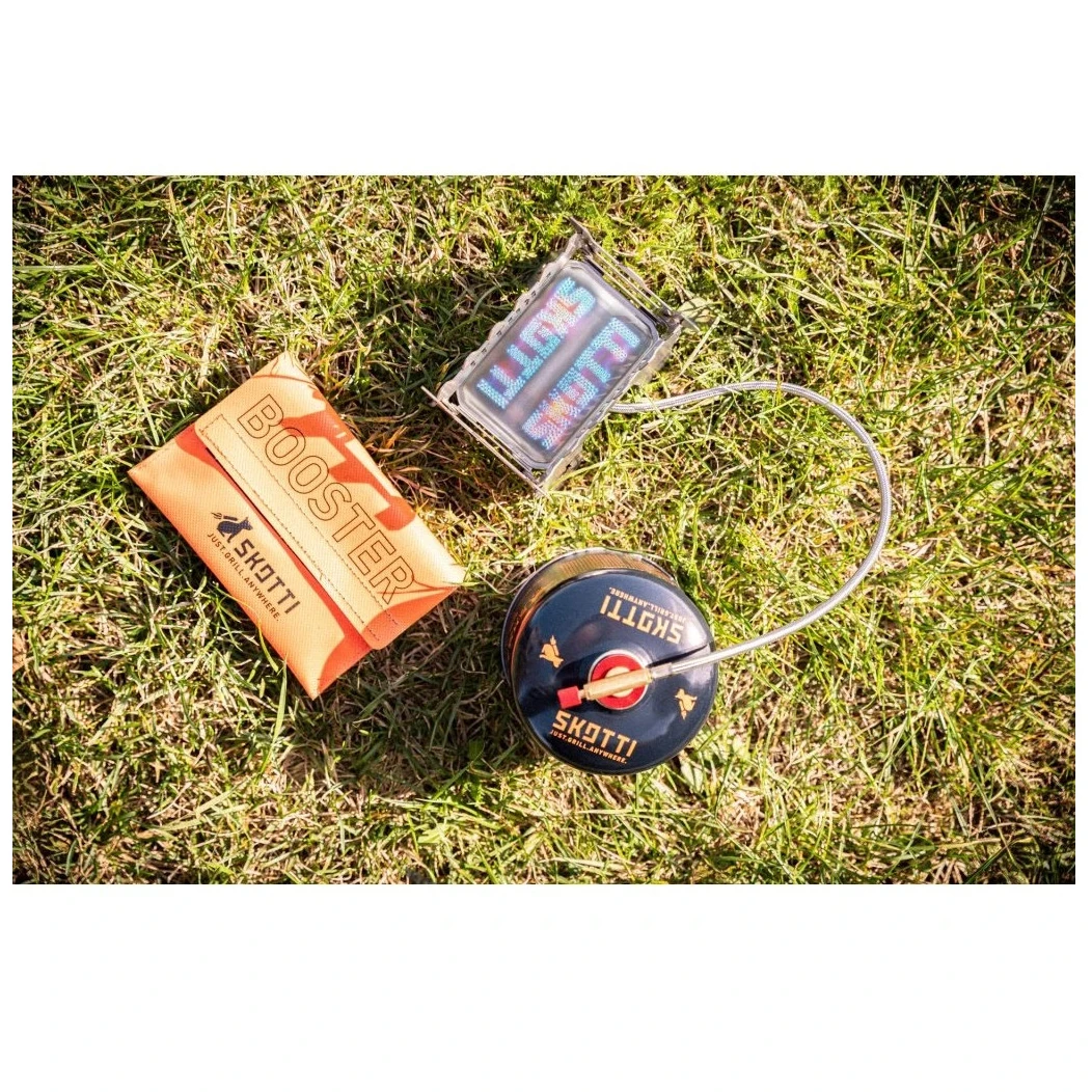 SKOTTI Booster è compatibile con tutte le cartucce a vite standard EN 417 e funziona con la maggior parte delle stoviglie comuni, che si tratti di padelle o pentole più piccole. Si abbina perfettamente anche alla griglia SKOTTI Mini, che può essere trasformata in una griglia a gas pulita e potente. Questa combinazione velocizza notevolmente la preparazione del cibo e semplifica la cottura dove non c'è spazio o tempo per accendere un fuoco.