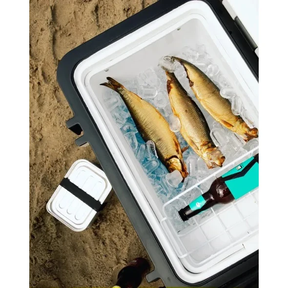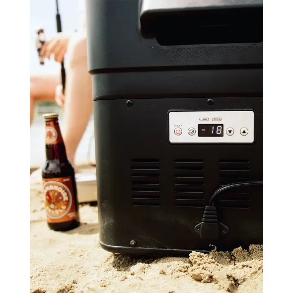 La scatola ha un design elegante e robusto. Grazie alla copertura di alta qualità e resistente, il box refrigerante può subire colpi. Inoltre, questo robusto dispenser è dotato di robuste cerniere in metallo, che lo rendono in grado di affrontare anche le condizioni più estreme. È inoltre dotato di maniglie ergonomiche che si ritraggono automaticamente per facilitarne il trasporto. Questa borsa termica ha una capacità di 42 litri, ideale per raffreddare bevande e congelare gelati. È possibile impostare facilmente la temperatura utilizzando il display digitale. Il refrigeratore è inoltre dotato di una funzione intelligente di scarico dell'acqua sul fondo, che consente di pulirlo in modo rapido e semplice.