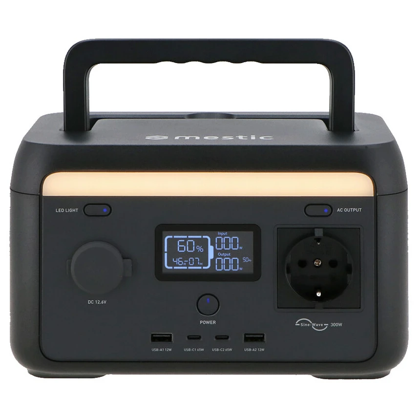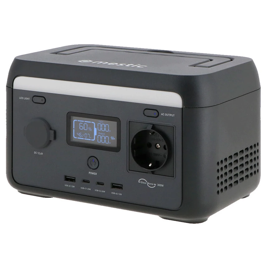 La stazione di ricarica Mestic MPS-300 è la soluzione ideale per gli appassionati di outdoor che necessitano di alimentare i propri dispositivi durante il campeggio o altre attività fuori dalla rete elettrica. Con una potenza di 300 W (picco fino a 500 W) è in grado di alimentare vari piccoli elettrodomestici, come telefoni, tablet o piccoli dispositivi da campeggio. È dotata di diversi connettori di uscita (AC, DC, USB-A, USB-C), consentendo così la ricarica di un'ampia gamma di dispositivi.