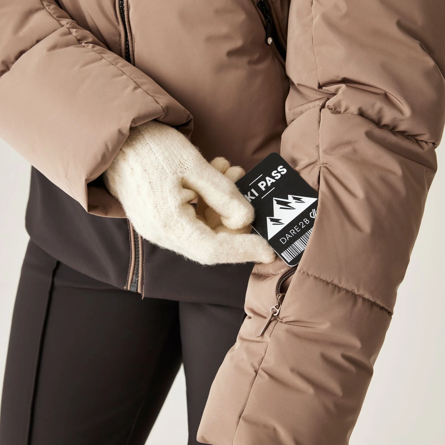 La giacca da donna Glitz Jacket di Dare 2b combina prestazioni sciistiche con un design elegante. Realizzata in tessuto ARED 15/15 impermeabile e traspirante, la giacca offre protezione da acqua e vento, mentre il cappuccio rimovibile e i dettagli in pile sul colletto assicurano comfort e calore.