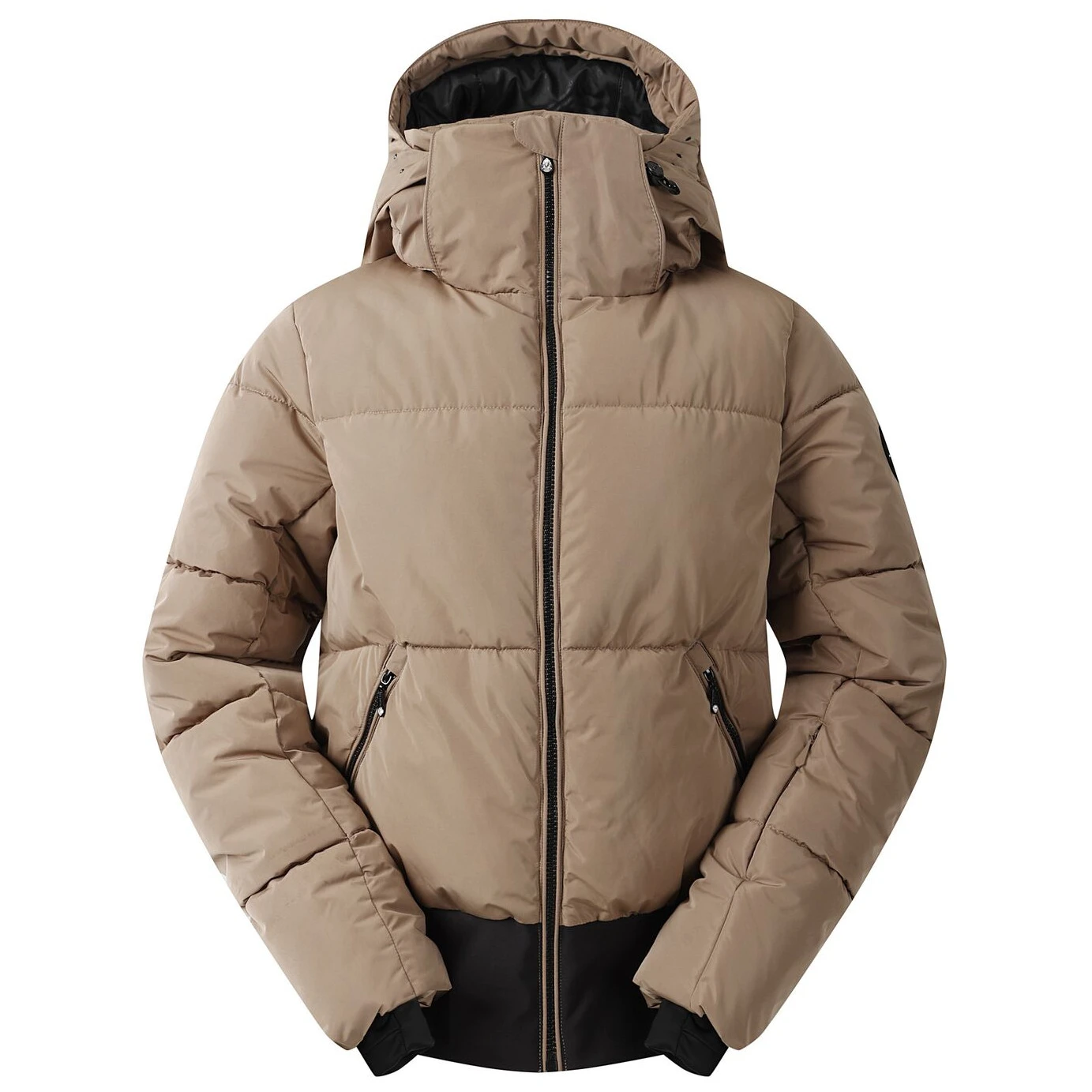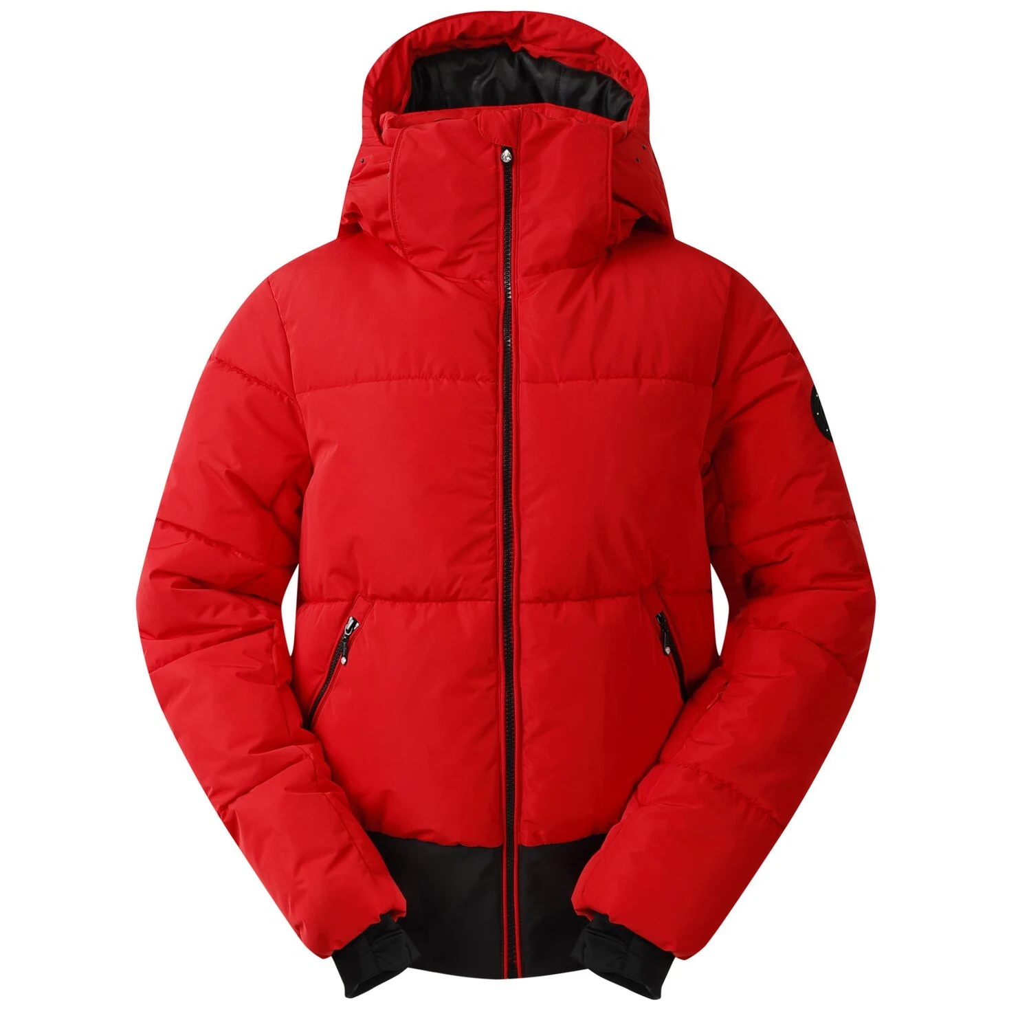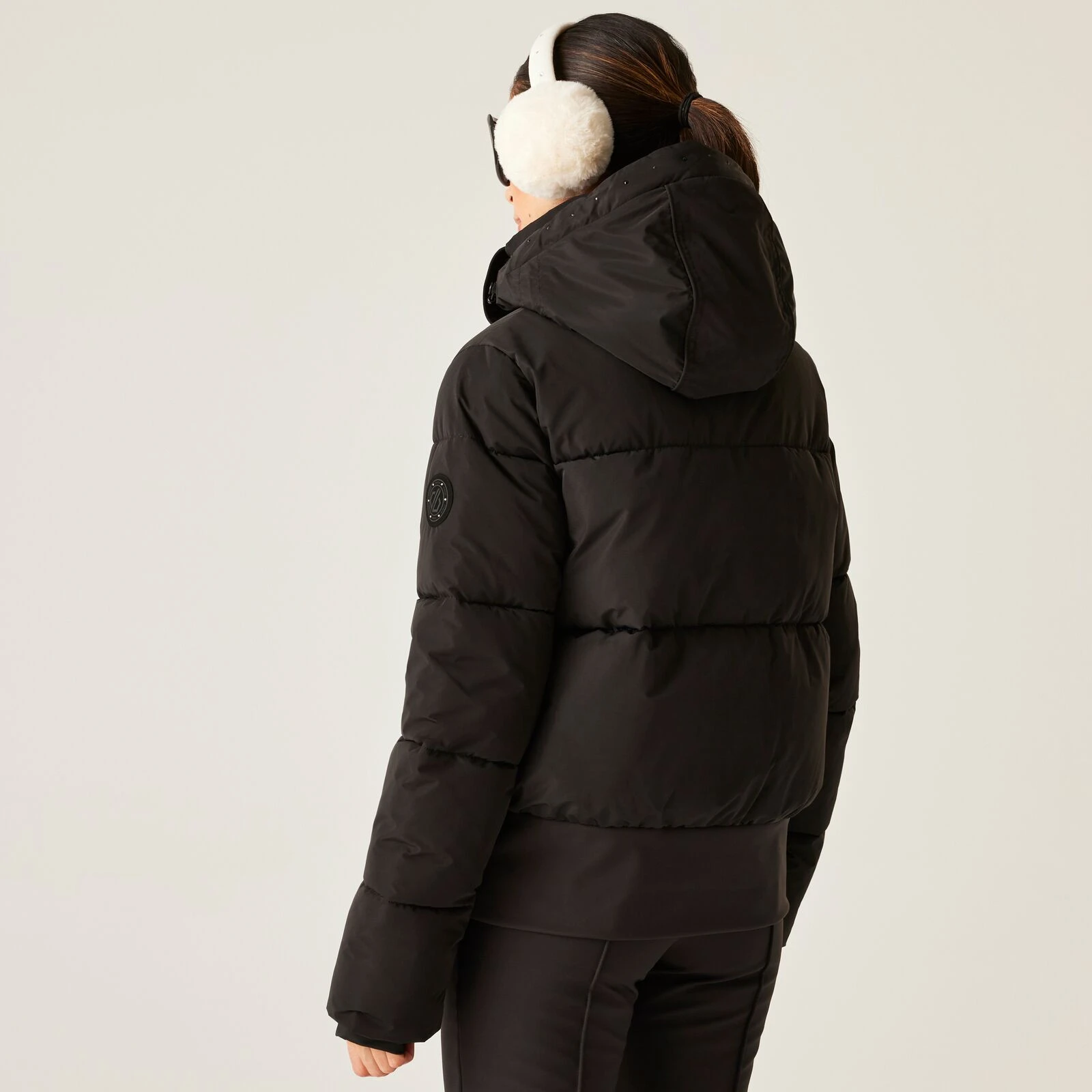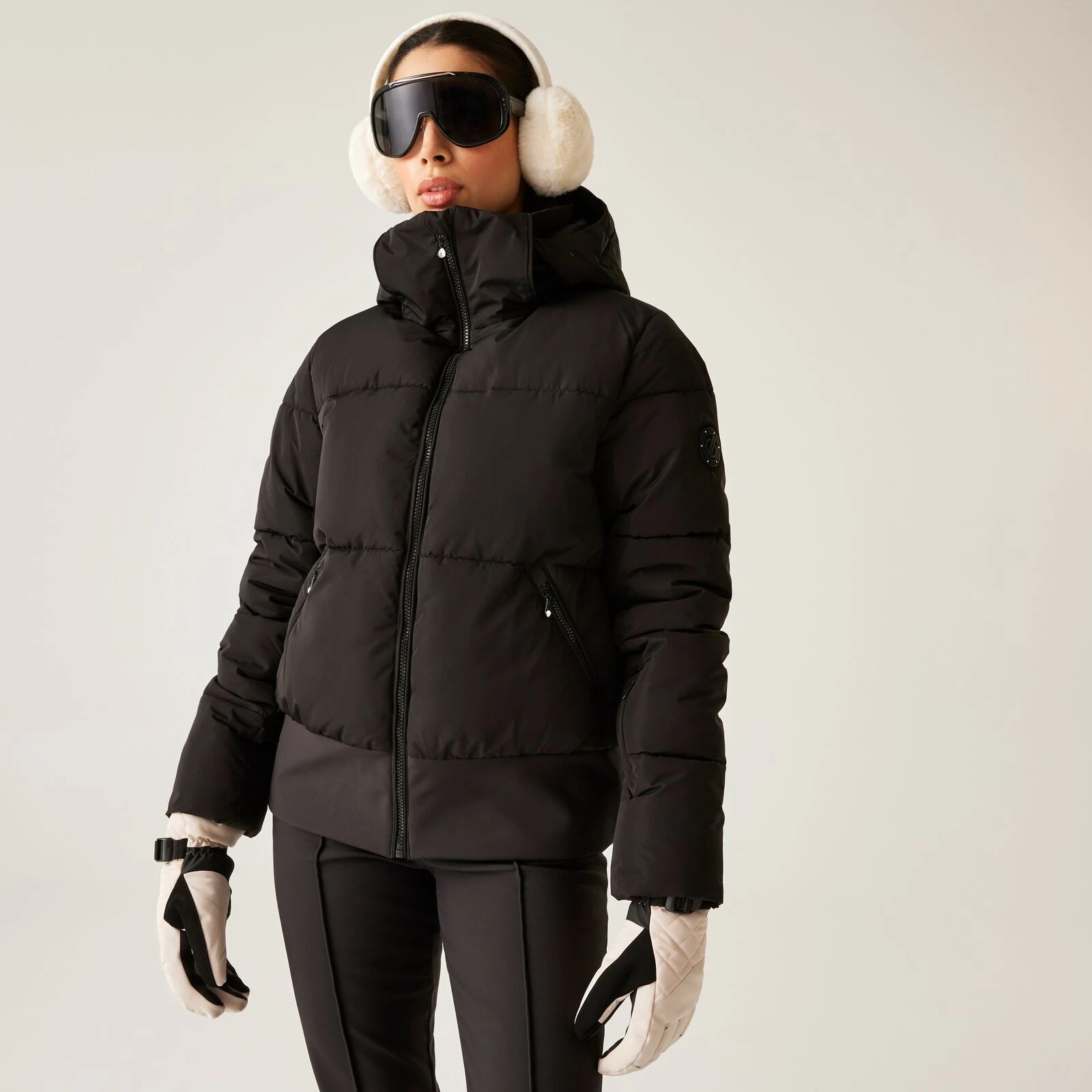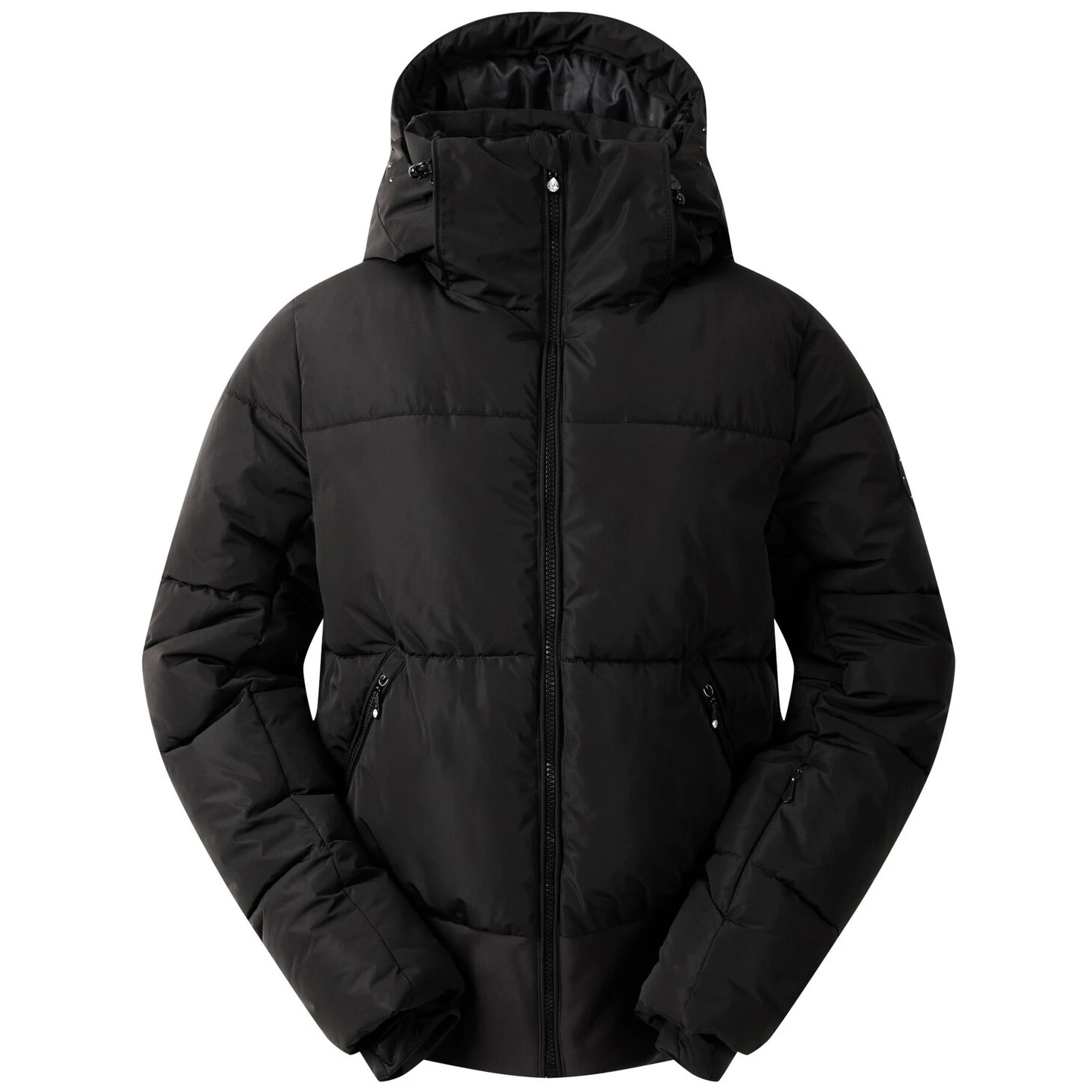 Le caratteristiche sciistiche di alto livello includono una tasca per lo skipass sulla manica, una tasca interna in rete con panno per occhiali e cuciture completamente nastrate per una protezione completa dall'umidità. L'aspetto elegante è sottolineato dalle decorazioni in cristallo sul cappuccio e sulle zip, che aggiungono brillantezza e uno stile lussuoso alla giacca, ideale per le giornate invernali sulle piste.