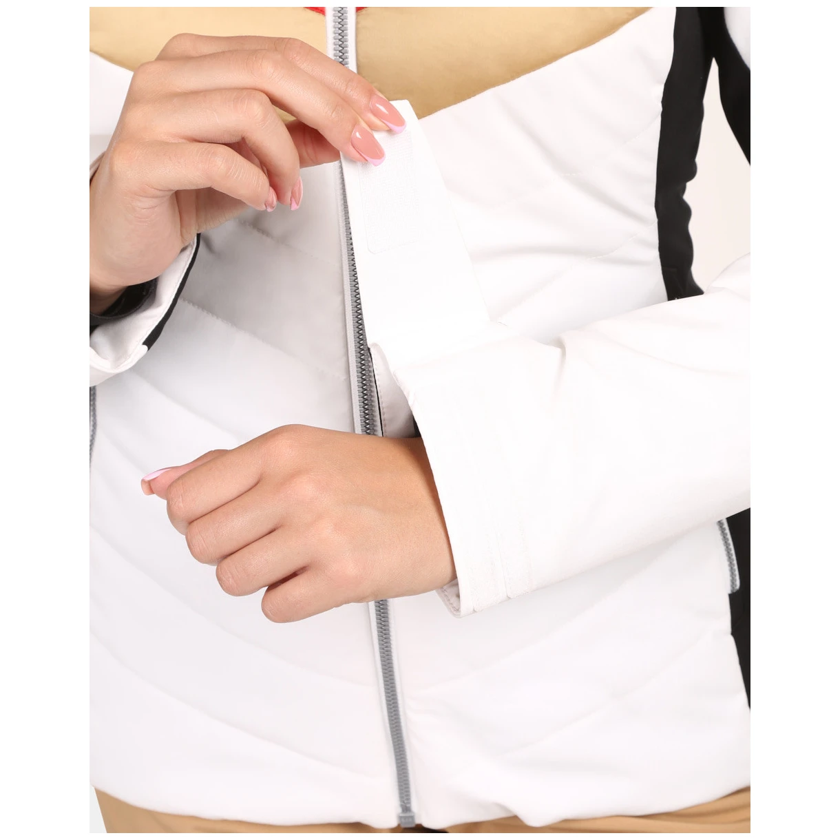 La giacca ha dettagli sofisticati come un ampio cappuccio fisso con pelliccia sintetica rimovibile, una tasca per lo skipass e una tasca interna con un panno per gli occhiali. Inoltre, è dotata di un colletto antineve interno e cuciture critiche nastrate che impediscono la penetrazione dell'umidità. Grazie al design elegante e al taglio che valorizza la figura femminile, è ideale per l'uso quotidiano e per gli sport invernali.