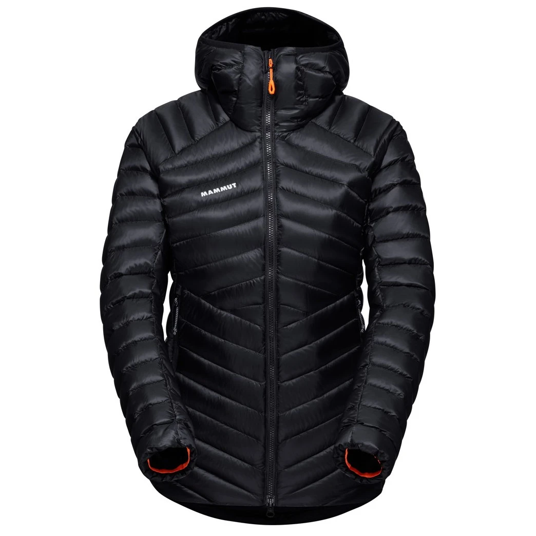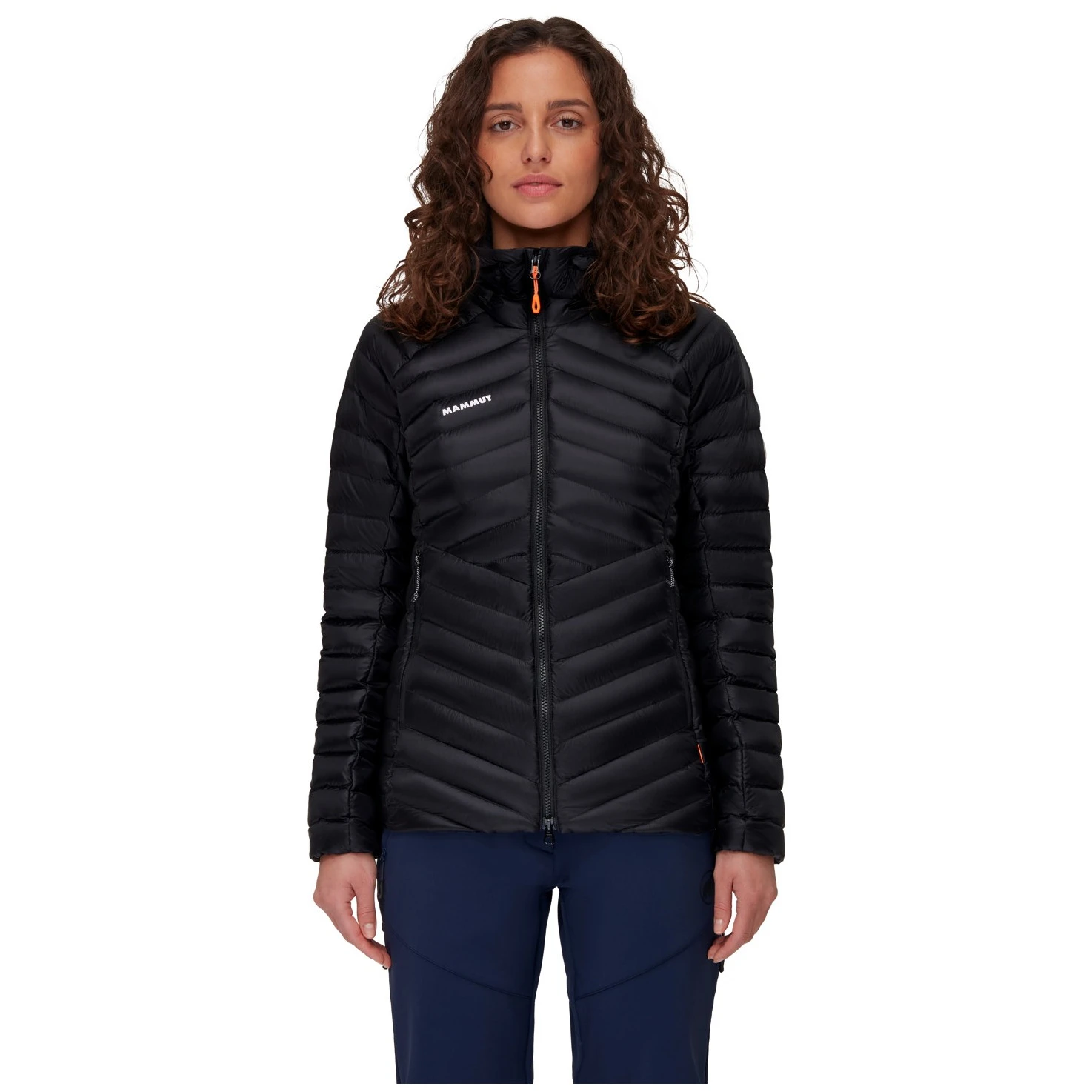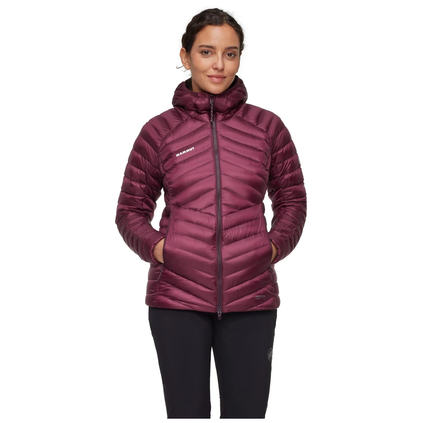 La giacca da donna in piuma Broad Peak IN Hooded Jacket Women di Mammut è un capo eccellente da avere con sé se hai in programma attività in montagna. È molto leggera e apprezzerete la possibilità di ripiegare la giacca in un piccolo pacchetto compatto utilizzando una delle tasche laterali. L'isolamento interno è garantito dalla piuma d'oca idrofoba, che isola in modo affidabile anche in condizioni di umidità. Il materiale esterno è Pertex® Quantum riciclato, non solo resistente all'abrasione ma anche all'acqua grazie al trattamento DWR. Il cappuccio con orlo elasticizzato si adatta perfettamente e non limita i movimenti.