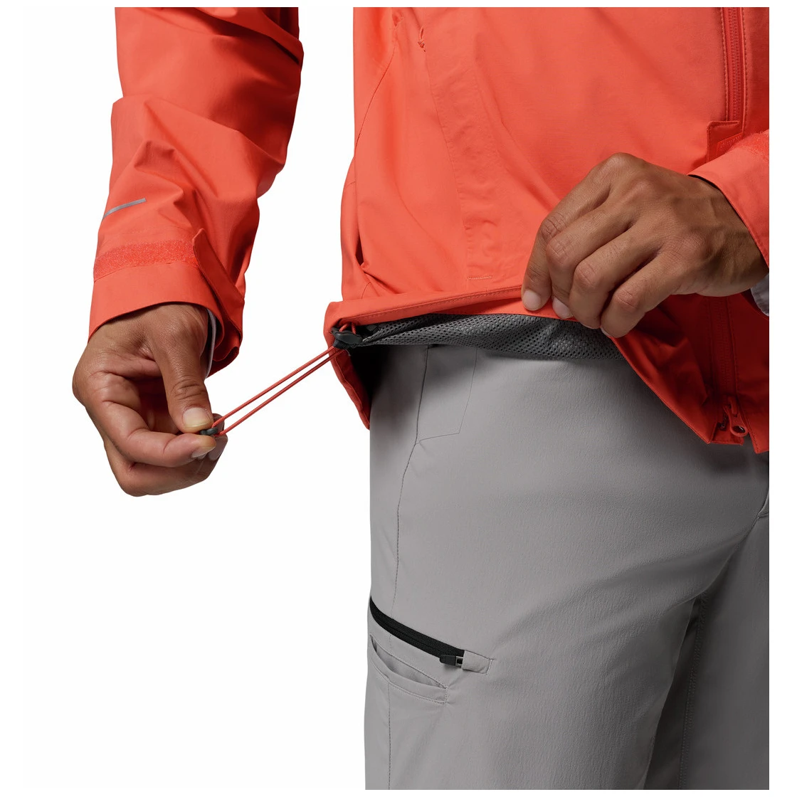 Il cappuccio integrato con regolazione del girovita e visiera nastrata aiuta a proteggere da pioggia e vento. I polsini regolabili e l'orlo con coulisse consentono l'adattamento alle condizioni attuali, mentre il pannello posteriore esteso aumenta la copertura della schiena. La protezione del mento contribuisce al comfort quando la giacca è completamente chiusa.