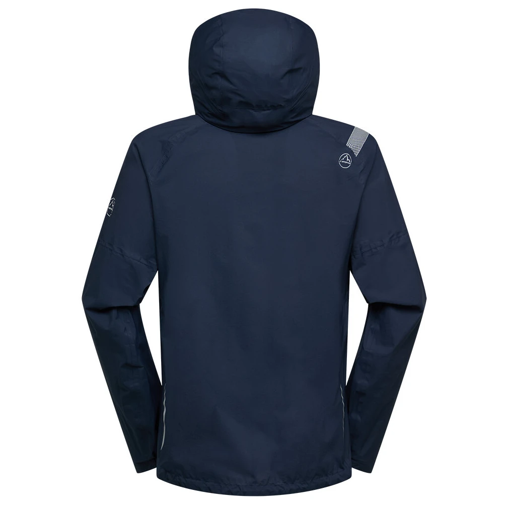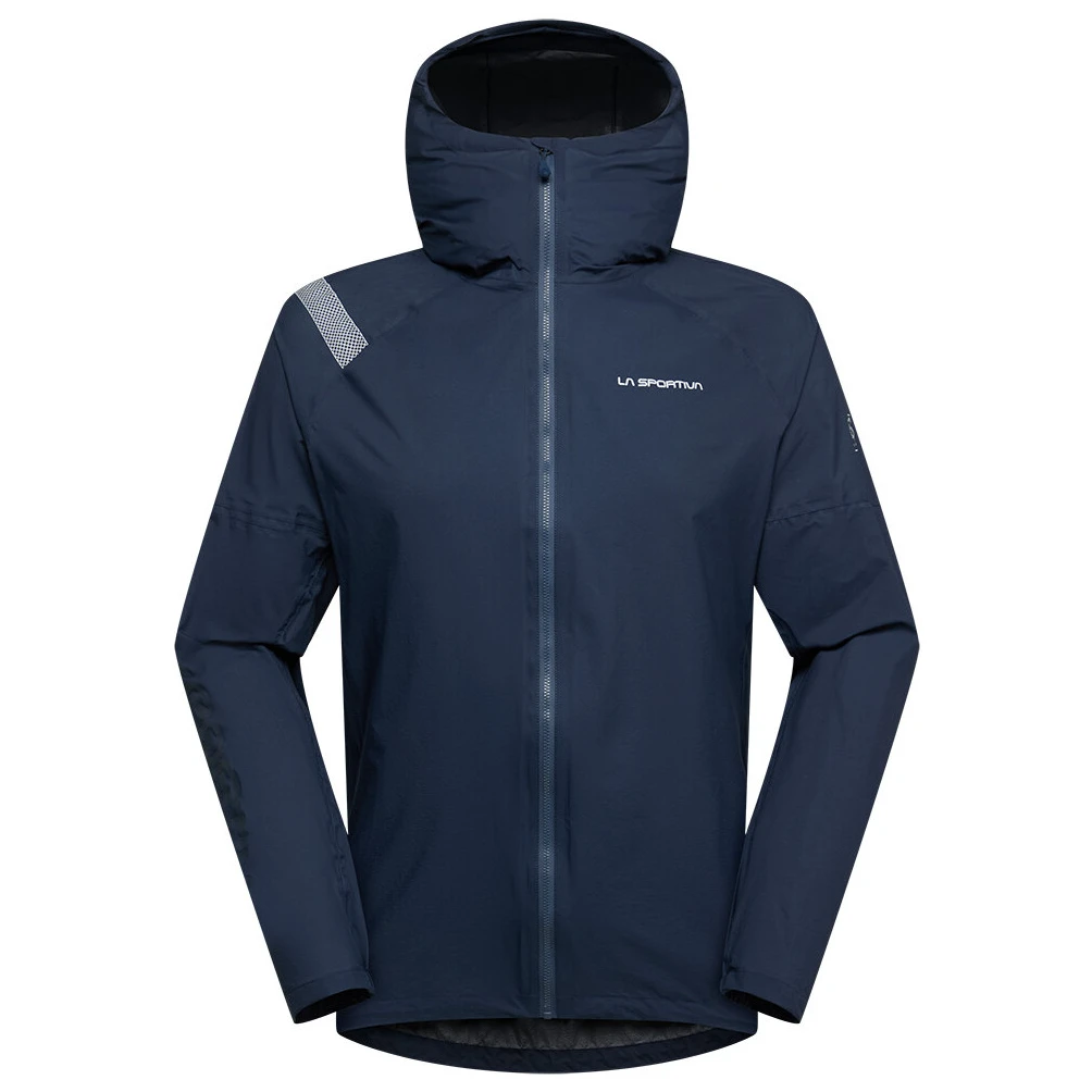 La giacca è dotata di un cappuccio sagomato e completamente regolabile che segue il movimento della testa durante la corsa e offre la massima protezione. Le prese d'aria sotto le ascelle aiutano a regolare la temperatura durante prestazioni intense. I polsini elasticizzati e l'orlo inferiore assicurano una vestibilità stabile senza limitare i movimenti.