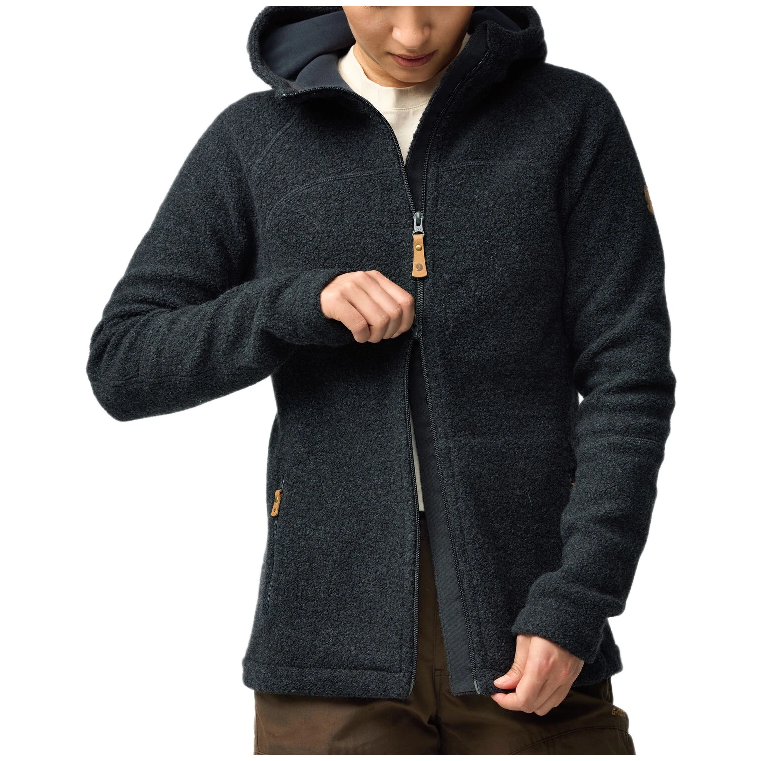 La giacca da donna Kaitum Fleece di Fjällräven combina comfort di lusso, funzionalità e un taglio elegante. Realizzata con una morbida miscela di lana merino ZQ e poliestere riciclato con poliammide, offre una termoregolazione ottimale, traspirabilità e resistenza all'usura. Il cappuccio aderente con fodera in micro pile protegge il viso, mentre la zip a due vie su tutta la lunghezza e la patta protettiva per il mento garantiscono il massimo comfort e flessibilità.