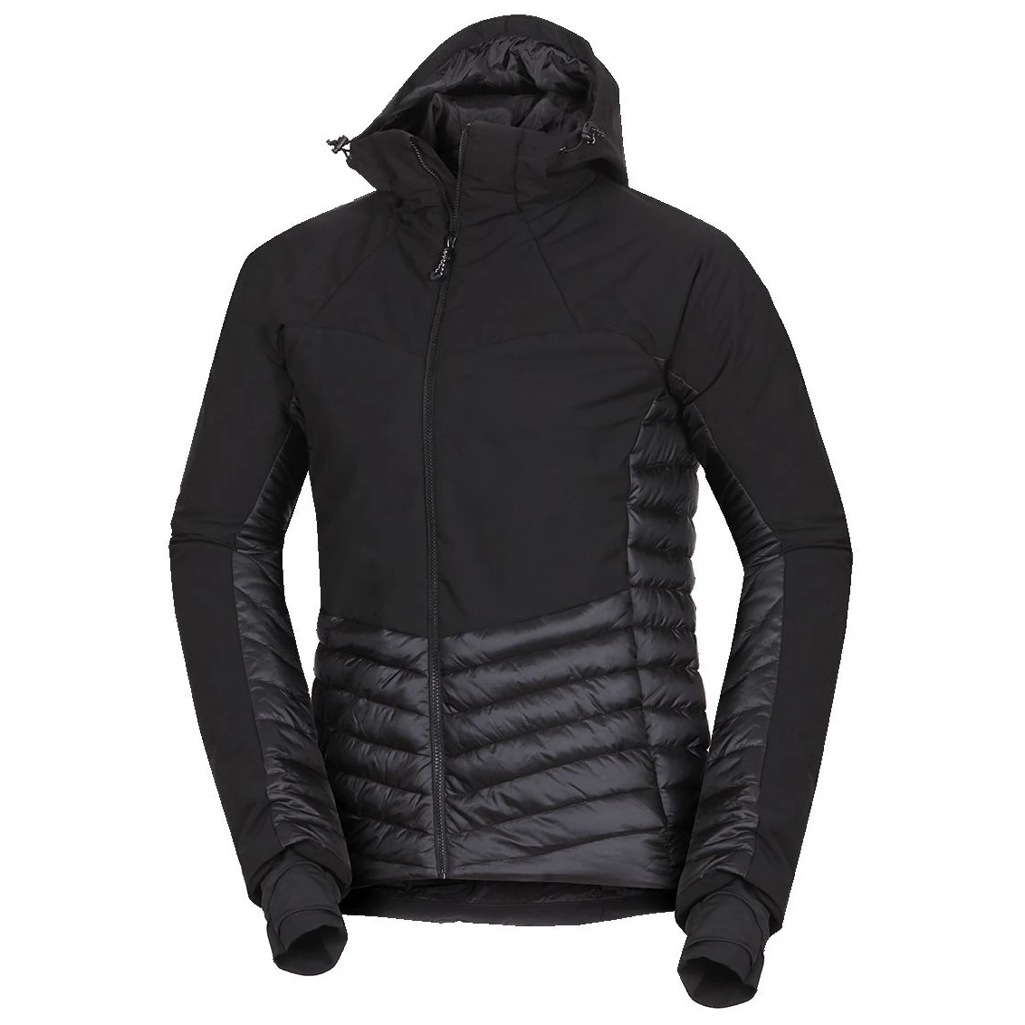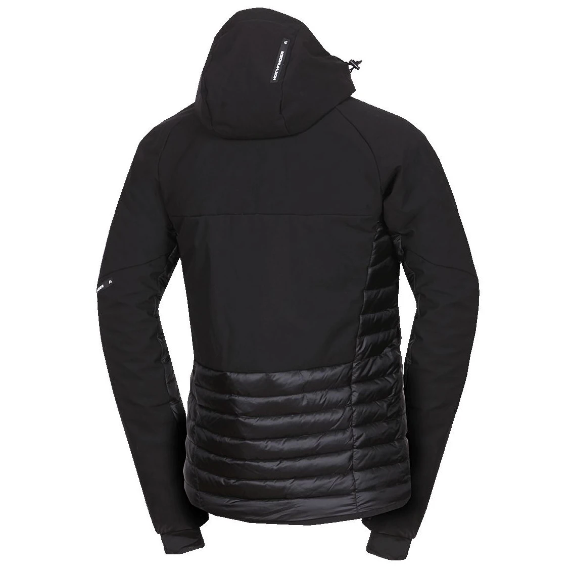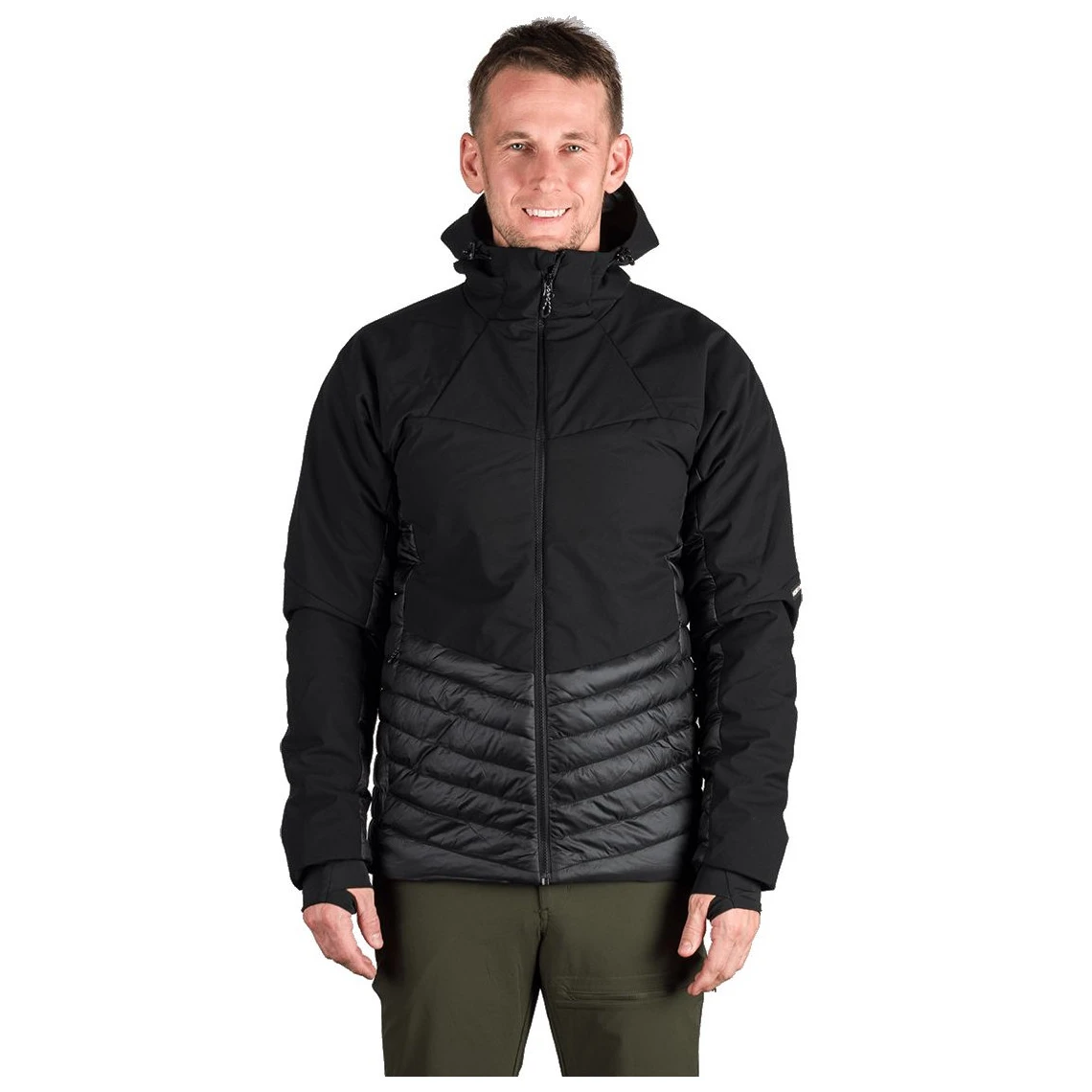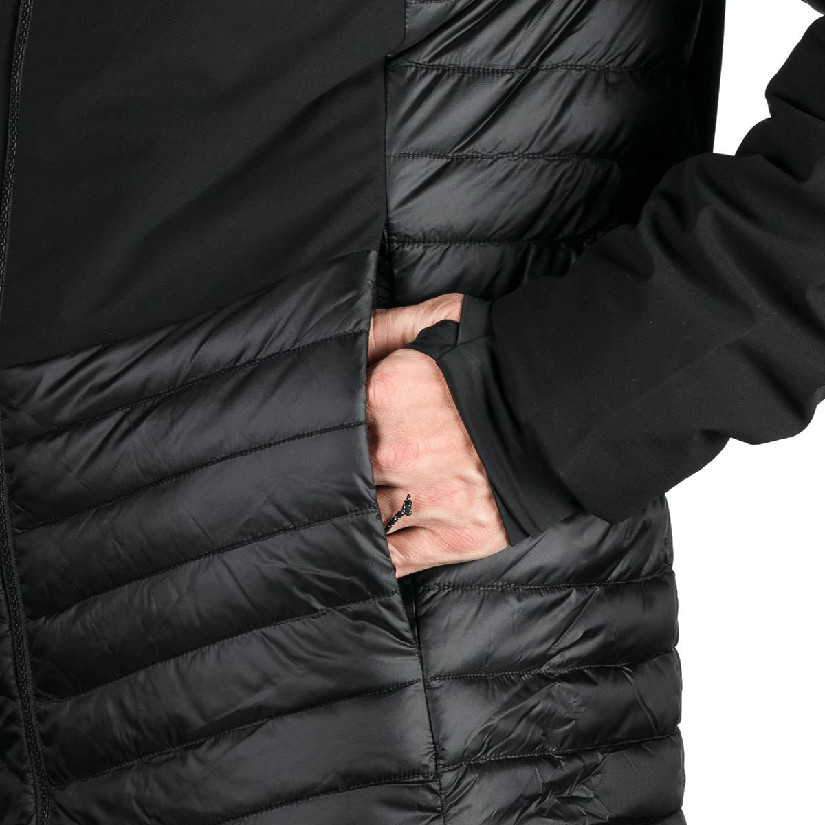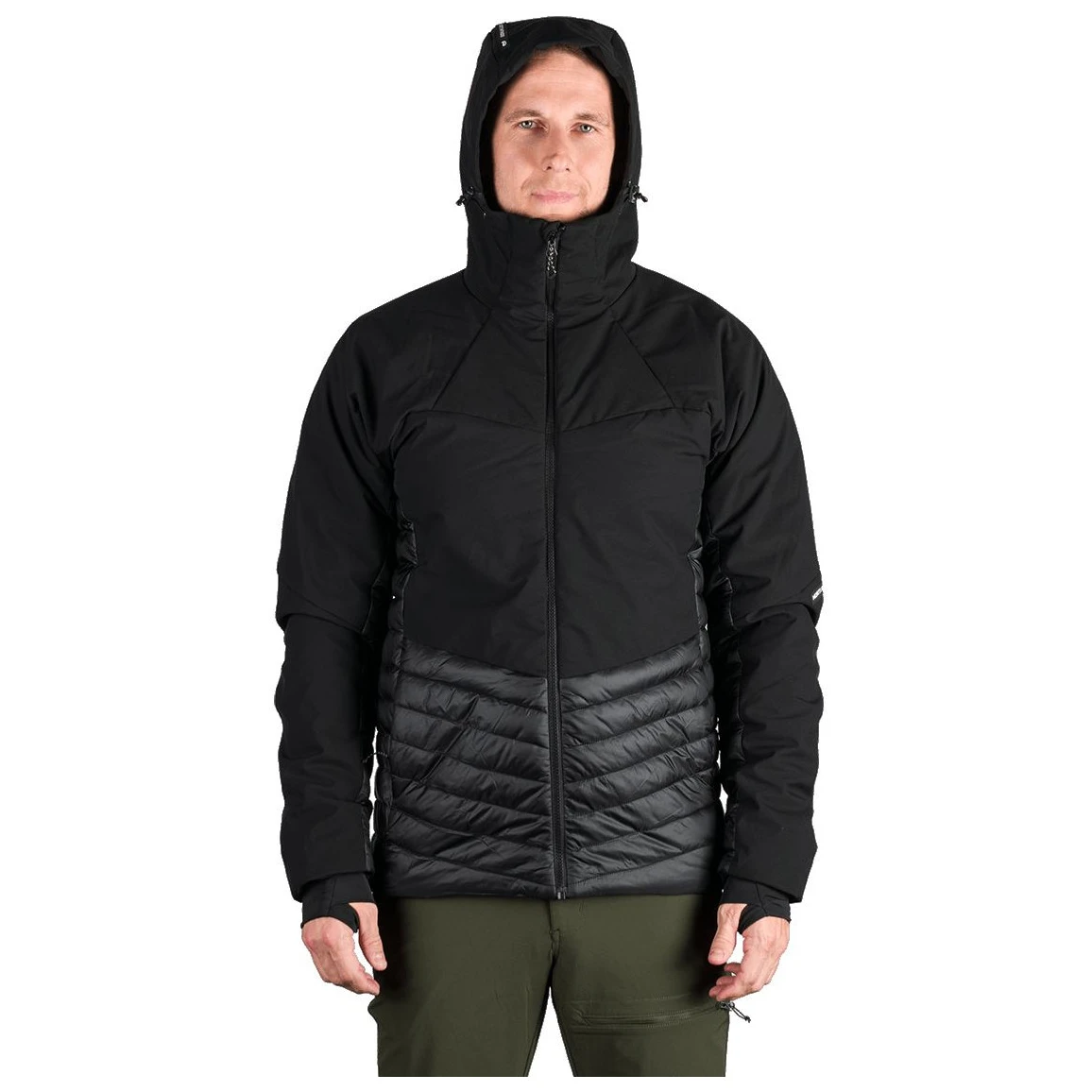 La parte superiore in softshell leggero a tre strati con membrana 20.000 mm H₂O / 20.000 g/m²/24 h protegge dal vento forte e dalla pioggia, mentre i pannelli anteriori e posteriori con membrana a 2,5 strati 10.000 mm H₂O / 10.000 g/m²/24 h garantiscono leggerezza e traspirabilità. La parte inferiore, i fianchi e l'interno manica, imbottiti con tessuto trapuntato con trattamento WR senza PFC, aumentano il comfort durante il movimento.