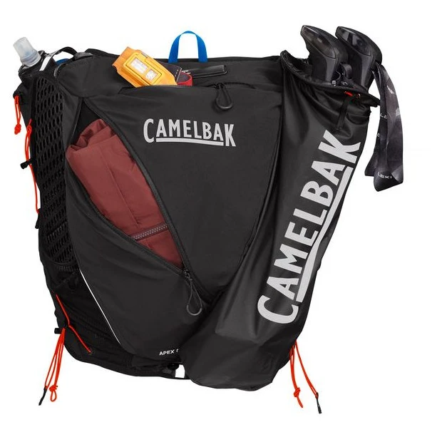 Dettagli pratici come la custodia rimovibile per i bastoncini da corsa, la tasca impermeabile con zip, le tasche esterne elasticizzate e la doppia cinghia pettorale regolabile rendono lo zaino Apex Pro la scelta ideale per i corridori che vogliono superare i propri limiti senza compromessi.