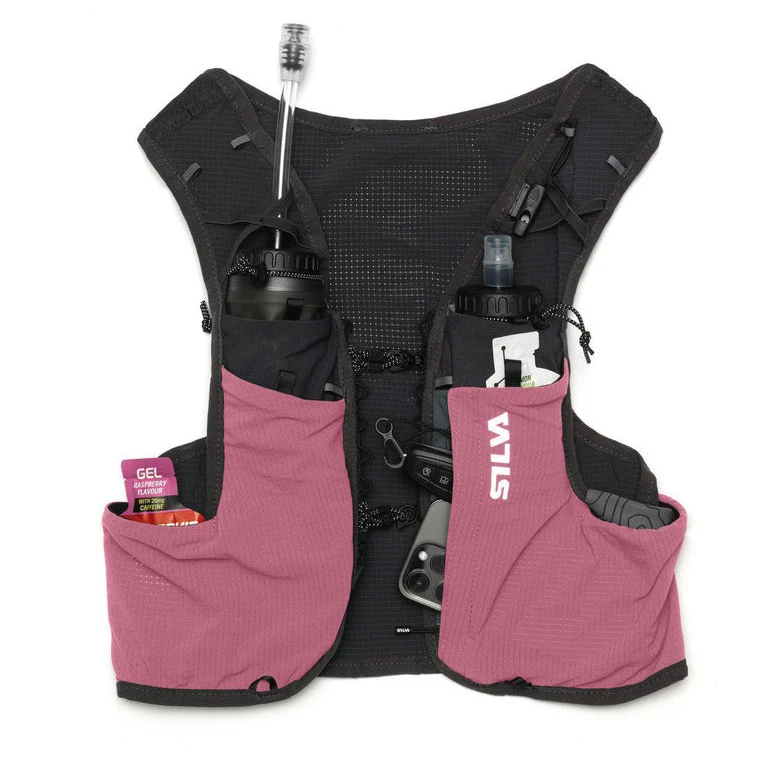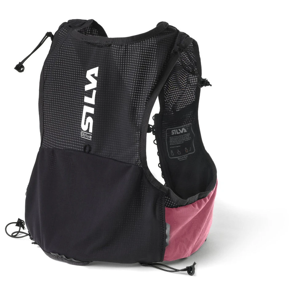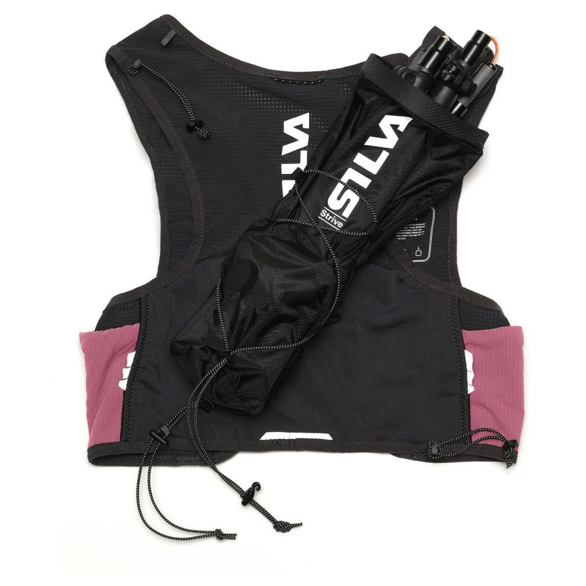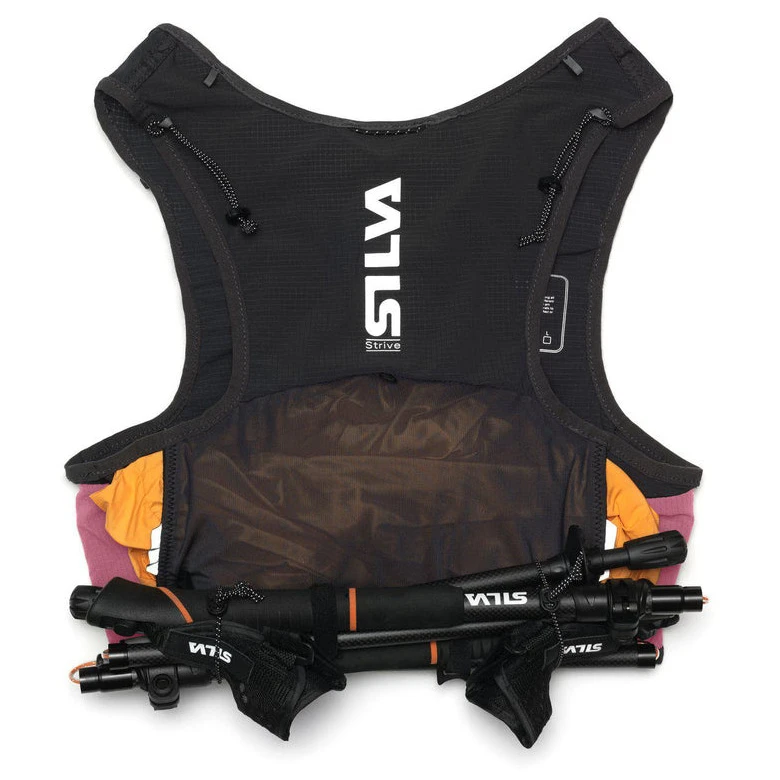 La schiena è dotata di due tasche: una tasca longitudinale inferiore e la tasca posteriore principale, che presenta due uscite per il cavo della lampada frontale o il tubo della sacca di idratazione. Una piccola tasca interna è destinata al fissaggio della batteria. I bastoncini possono essere fissati utilizzando i passanti flessibili regolabili, oppure inseriti nella borsa Silva Quiver, che facilita la rimozione dei bastoncini dal gilet durante le gare (borsa non inclusa).