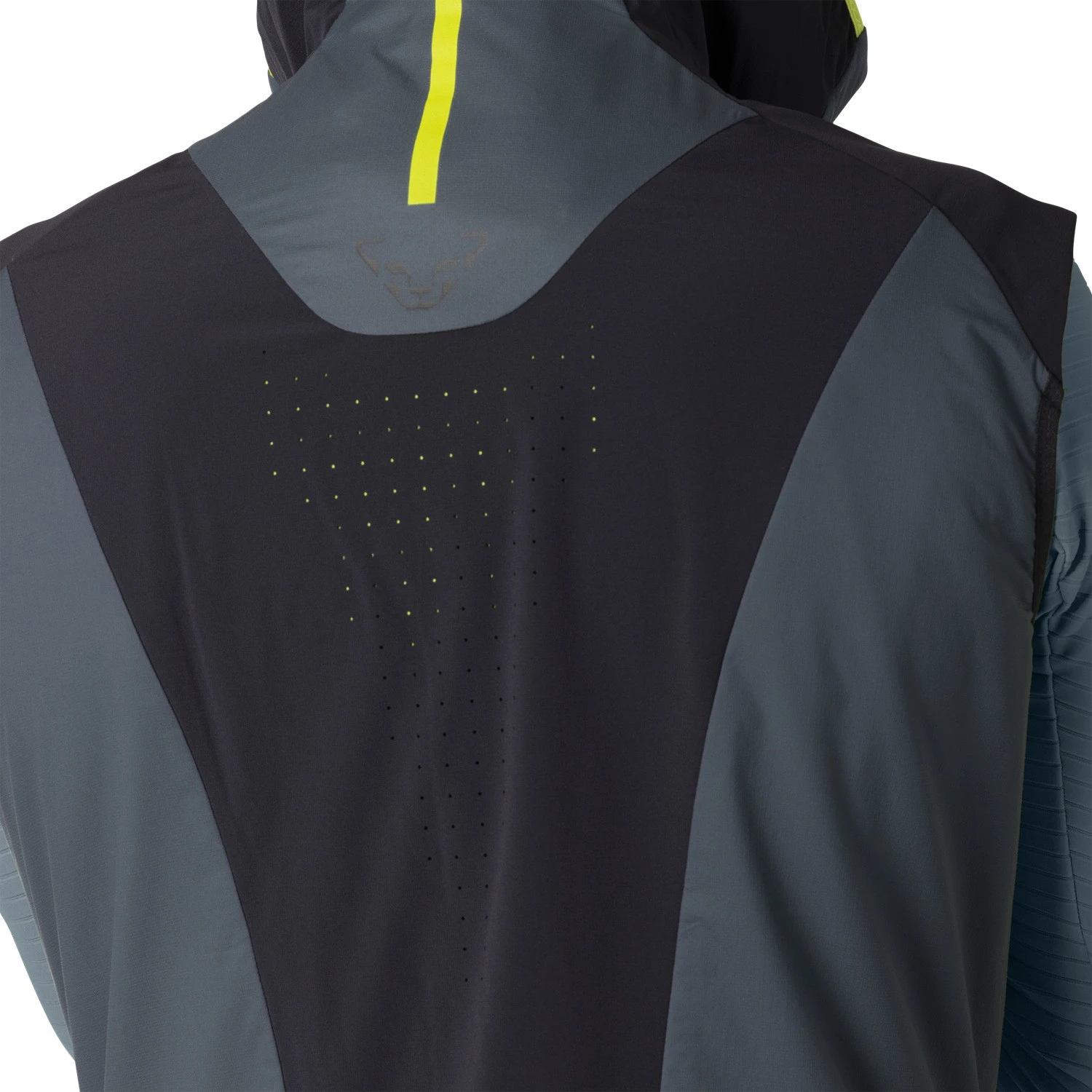 Nelle zone in cui si indossa uno zaino sulla schiena, l'isolamento è stato sostituito da un inserto in tessuto elasticizzato perforato per una maggiore traspirabilità. Il gilet offre una vestibilità aderente ed è dotato di inserti elasticizzati per una forma perfetta senza scivolare durante i movimenti intensi. Due tasche anteriori con zip offrono spazio per riporre piccoli oggetti, come il telefono o uno snack.