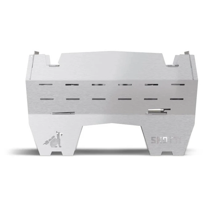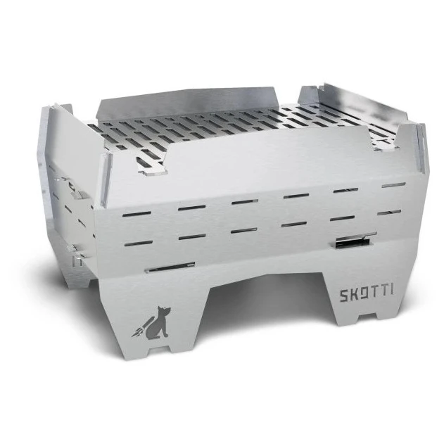 Il combustibile sotto forma di legna o carbone si aggiunge comodamente dal lato, in modo da avere sempre il fuoco sotto controllo e poter regolare facilmente l'intensità della fiamma. Questo metodo di riscaldamento è ideale per una rapida cottura alla griglia, per scaldare l'acqua o per cucinare sotto una piccola pentola. Tuttavia, se hai bisogno del massimo controllo della temperatura e di una cottura senza fumo, puoi semplicemente posizionare la griglia sul fornello a gas SKOTTI Booster (accessorio opzionale). In questo modo otterrai una fonte di calore pulita, potente e molto ben regolabile, che apprezzerai nella preparazione di carne, verdure e piatti più delicati, dove una temperatura stabile è fondamentale – anche in condizioni di vento.