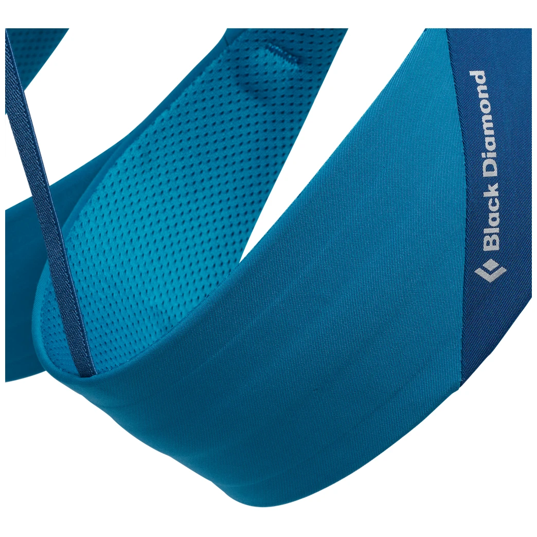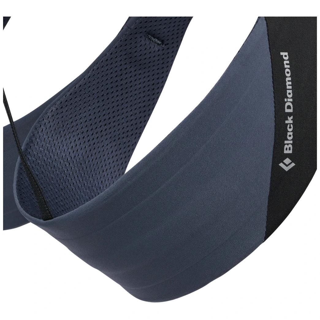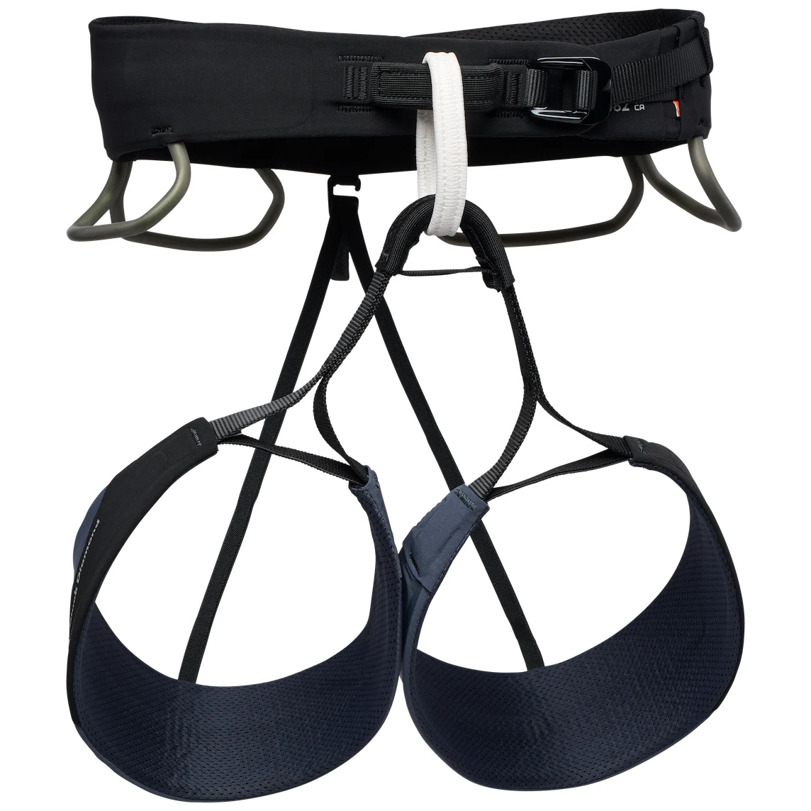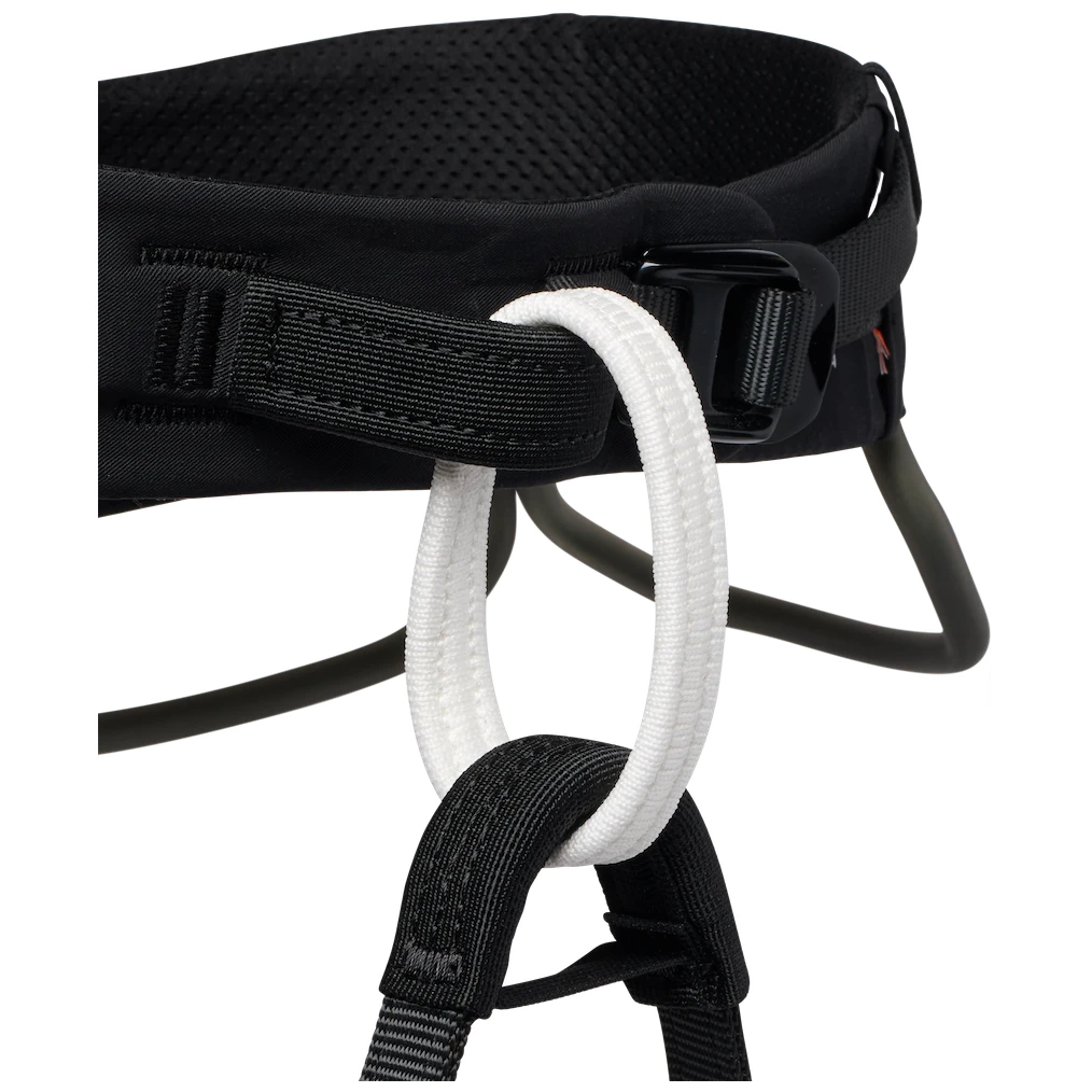 Per l'assicurazione viene utilizzata una fettuccia Infinity Loop senza cuciture. Sull'imbracatura troverete quattro portamateriali di grandi dimensioni, termoformati, che possono contenere fino a trenta moschettoni. Il quinto portamateriale a basso profilo sul retro è molto facilmente accessibile.