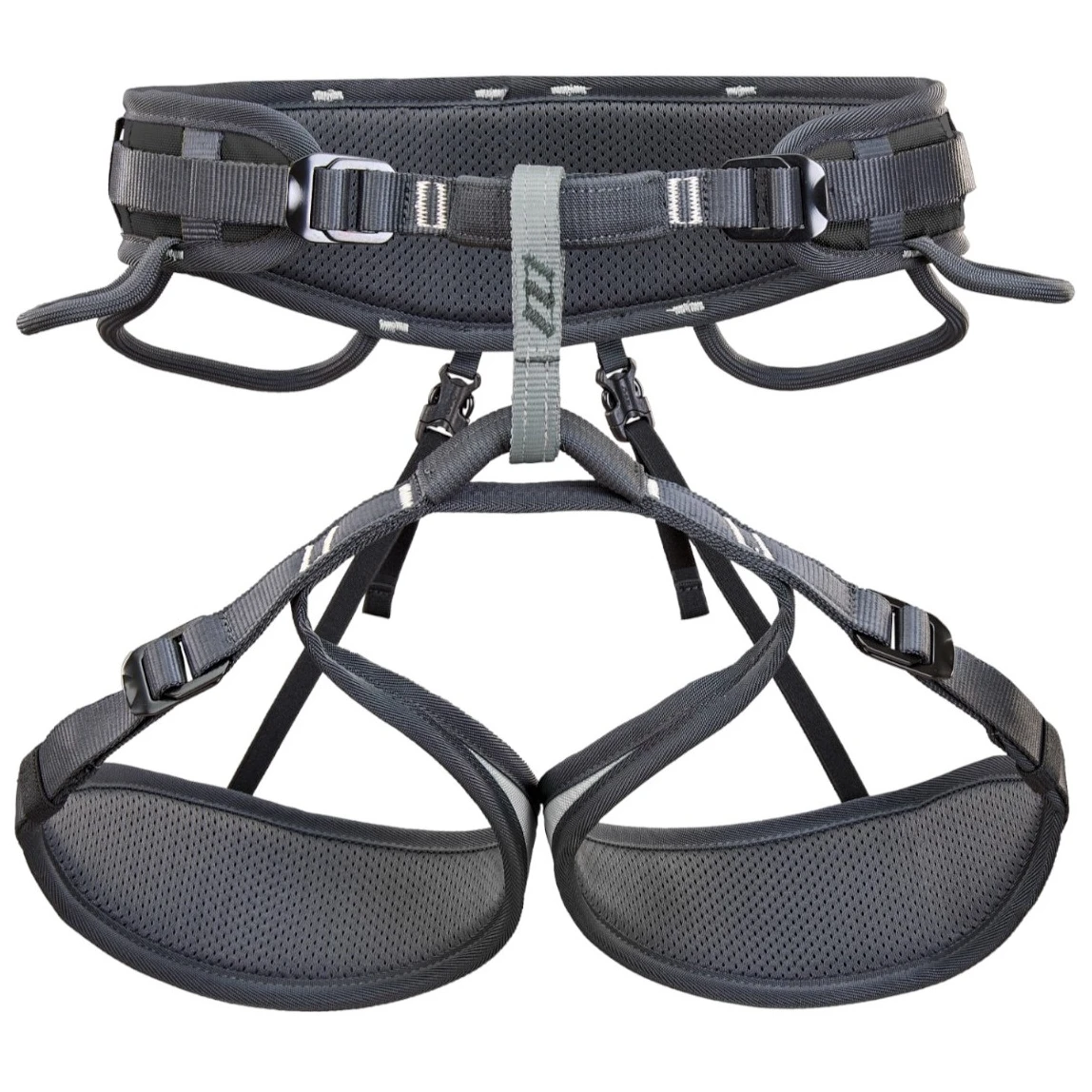 Le quattro fibbie di regolazione consentono la precisa regolazione della vita e dei cosciali in base alla corporatura e allo strato di abbigliamento. La cintura ergonomica e i cosciali assicurano un'equa distribuzione del carico e comfort durante la sospensione, senza limitare i movimenti.