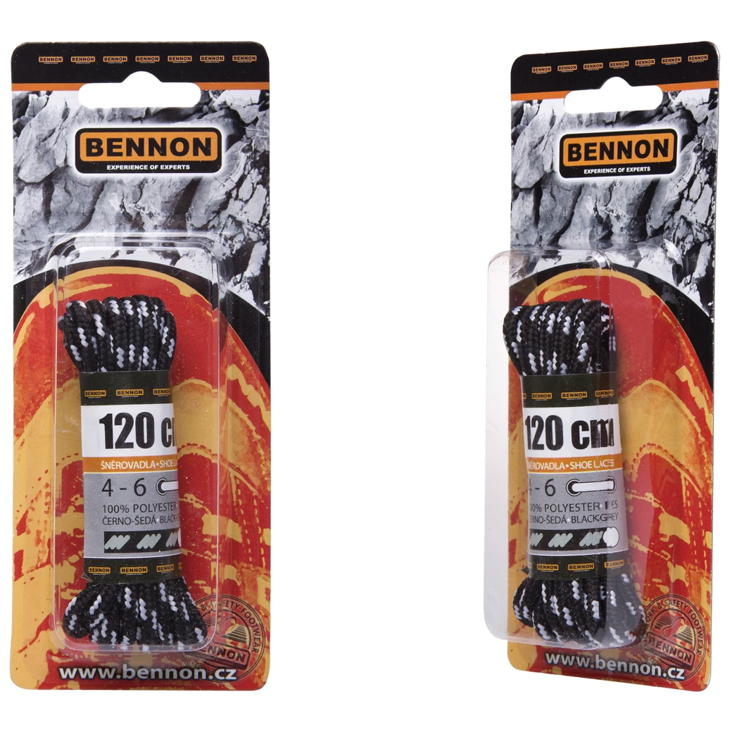 Si sono rotti i lacci delle scarpe? Lacci per scarpe di Bennon Laces Nero-Grigio in confezione da 120 cm. Sono robusti e durano a lungo. I lacci sono adatti a scarpe con 4-6 fori.
