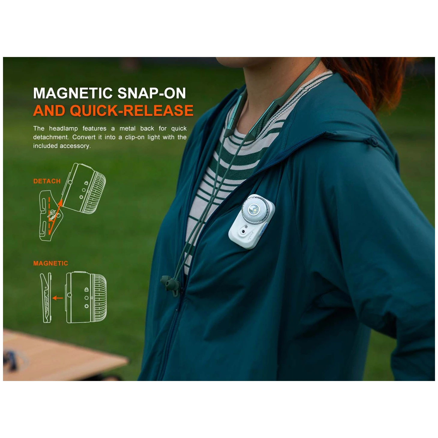 L'esclusivo fissaggio della lampada frontale nel supporto tramite magnete consente di estrarla immediatamente e utilizzarla come torcia manuale. Tramite la clip in dotazione è possibile fissarla alla cinghia dello zaino, alla tasca o alla cintura. Grazie al potente magnete è possibile fissarla a una superficie di ferro come luce da lavoro, lampada o persino attaccarla semplicemente ai vestiti. Indossala sulla testa, in mano, sul petto: la fantasia non ha limiti!