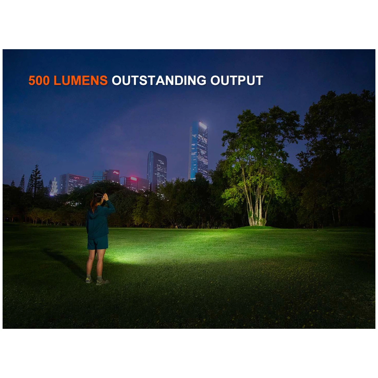 Quattro modalità di luce bianca: 500 lumen (2,8 ore) -> 150 lumen (5,5 ore) -> 30 lumen (23 ore) -> 5 lumen (96,8 ore).