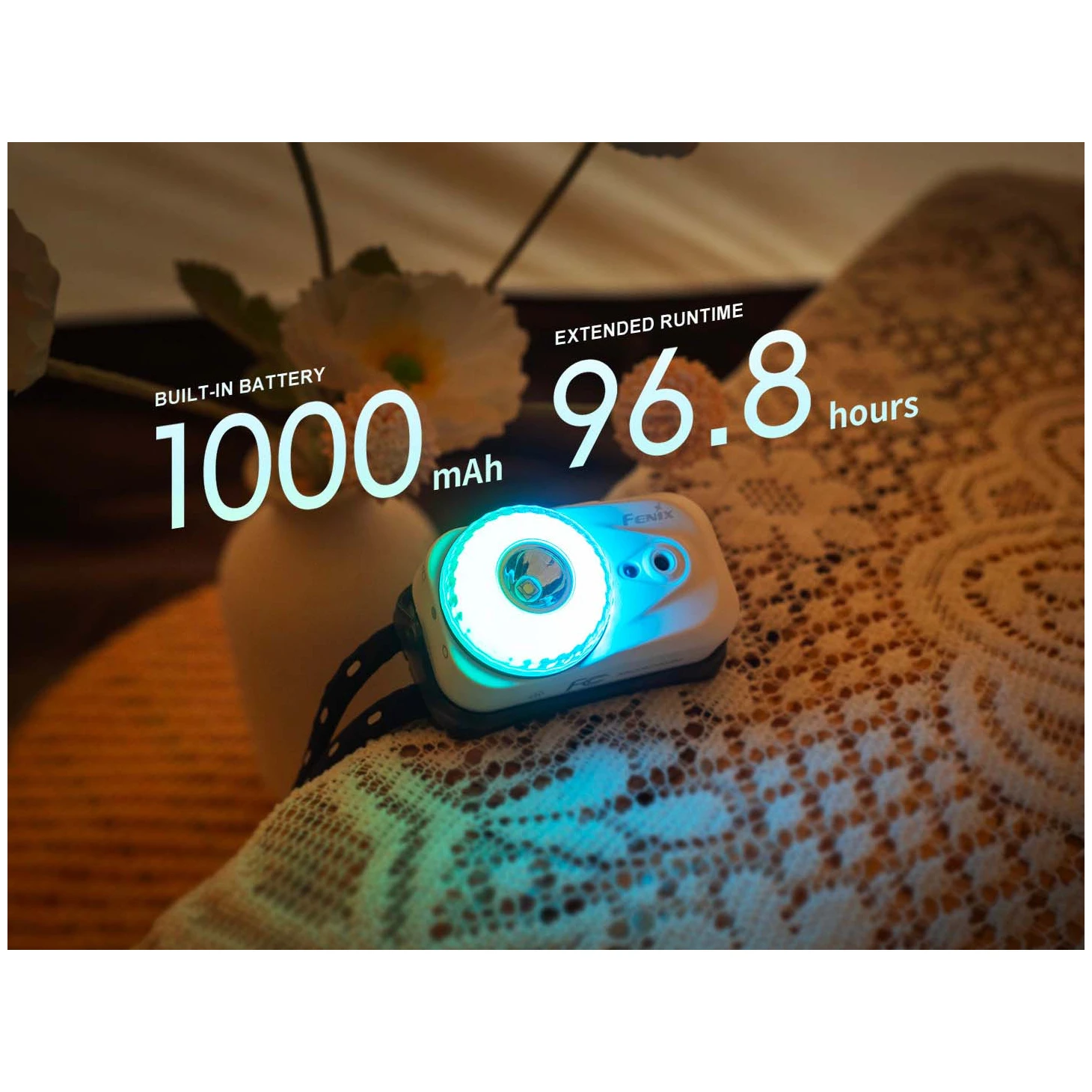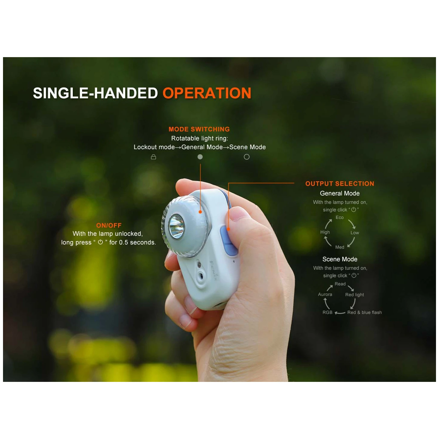 Cinque modalità atmosferiche:luce di lettura 15 lumen (8,9 ore) -> luce rossa 3 lumen (11,5 ore) -> luce rossa e blu lampeggiante 3 lumen -> RGB 2 lumen -> Aurora 2 lumen