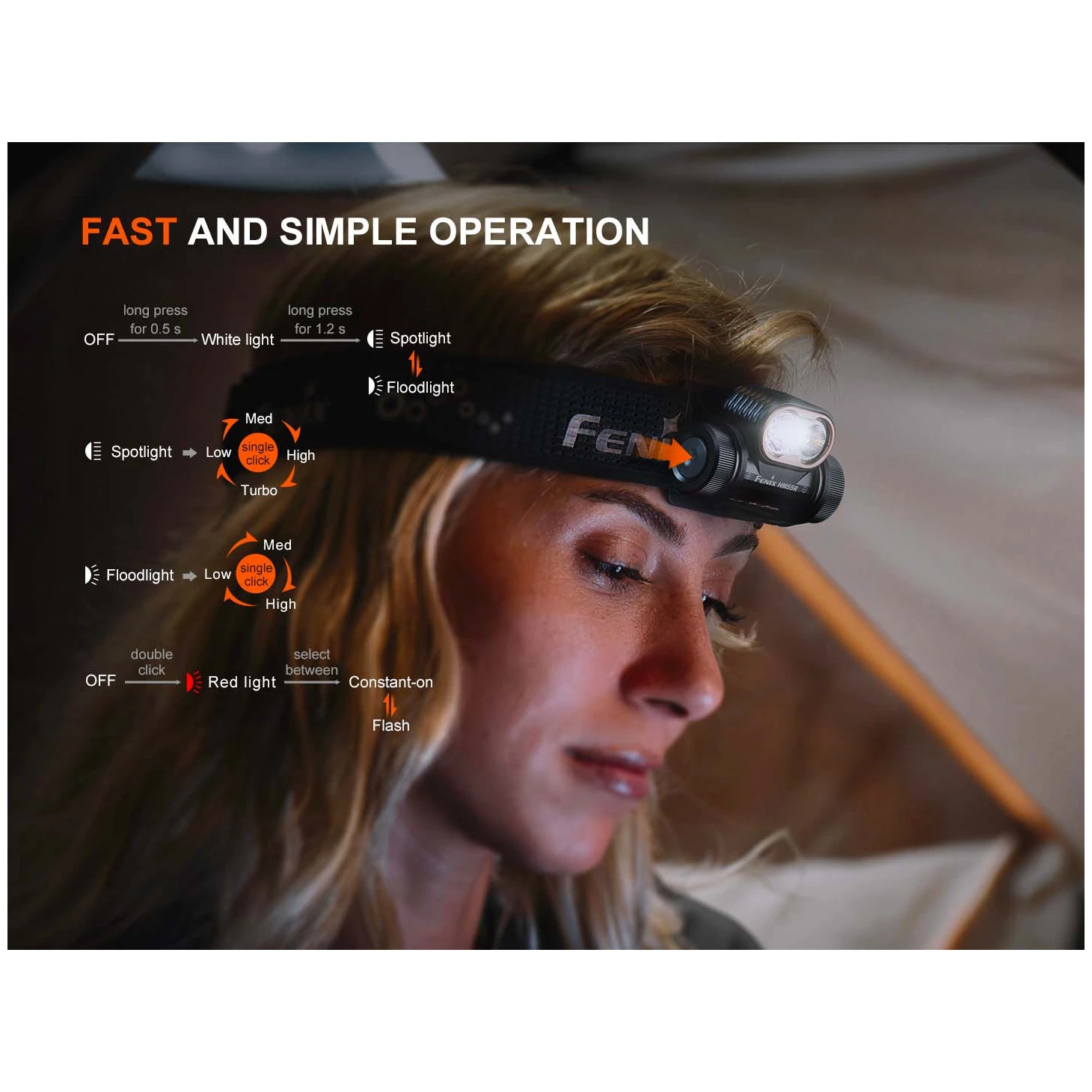 È disponibile anche una luce rossa e un lampeggiante con una potenza di 5 lumen. Per l'alimentazione utilizza una batteria agli ioni di litio di tipo 18350 con una capacità di 1600 mAh, inclusa nella confezione e ricaricabile tramite il moderno connettore USB-C direttamente nella lampada frontale. La lampada frontale può essere alimentata in caso di emergenza anche con batterie RCR123A (16340) e batterie usa e getta CR123A. La lampada frontale è dotata di un'ampia e comoda cinghia. Il cinturino è traforato per una rapida traspirazione del sudore e dotato di elementi riflettenti per garantire una buona visibilità passiva durante la corsa su strada.