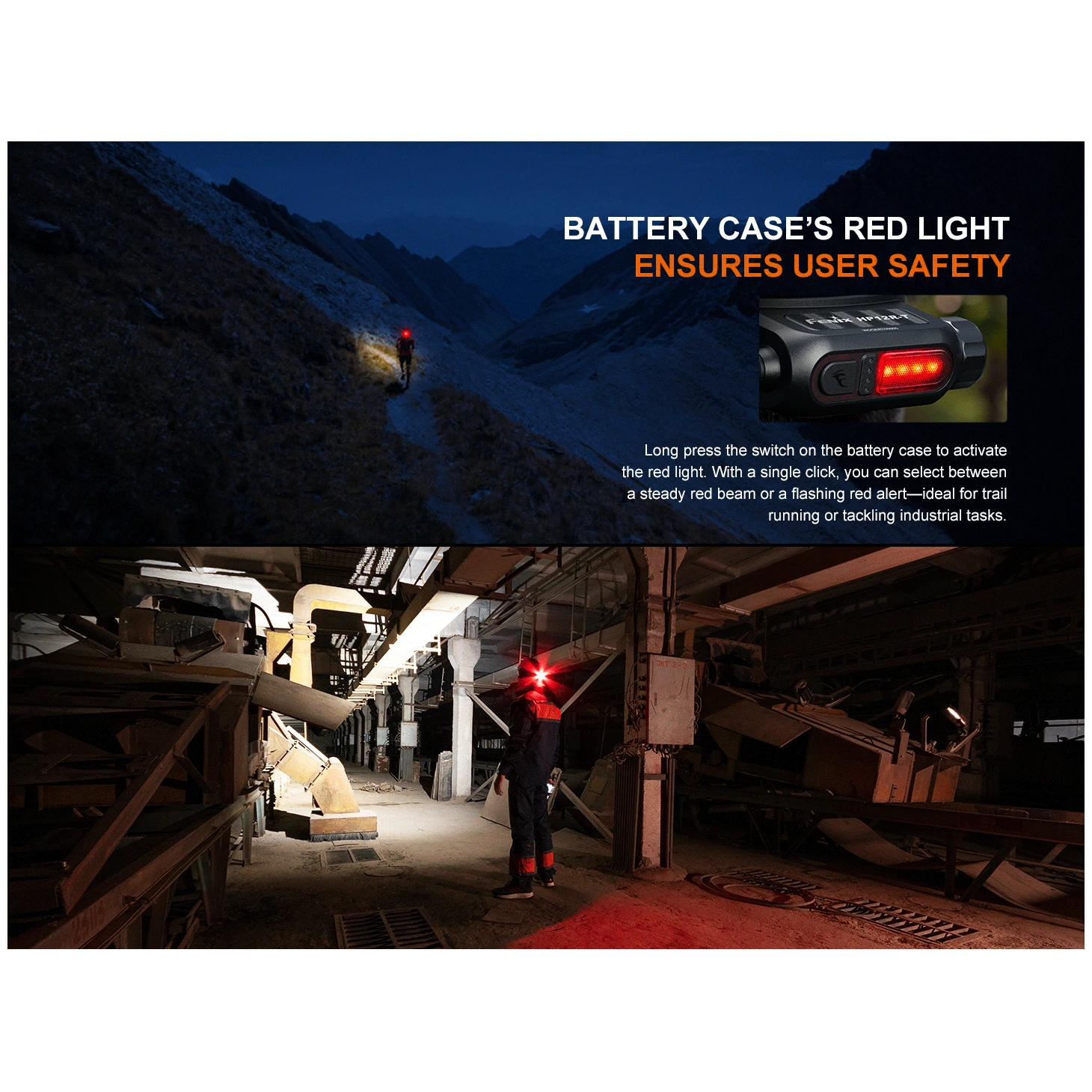 Il riflettore principale offre quattro modalità di illuminazione (fino a 1300 lm) e il secondo riflettore tre modalità (fino a 500 lm). Per le massime prestazioni, è possibile attivare entrambi i riflettori contemporaneamente in modalità turbo (1300 lm) o in modalità bassa (70 lm). Per la sicurezza e le situazioni speciali, la lampada frontale è dotata anche di luce rossa anteriore, lampeggio SOS rosso e luce rossa e lampeggiante sul vano batteria posteriore.