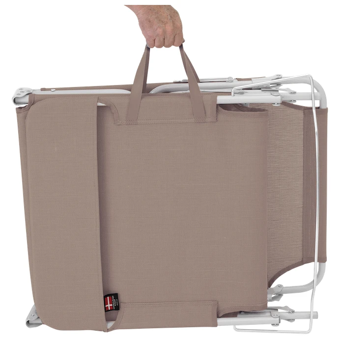 La struttura del lettino è realizzata in acciaio verniciato a polvere resistente, completata da un piacevole tessuto a maglia in 100% poliestere, facile da pulire e mantenere. Il lettino vanta inoltre uno schienale regolabile che può essere impostato su 3 diverse posizioni. In questo modo è possibile scegliere l'angolo ideale per le proprie esigenze. Le dimensioni compatte garantiscono una facile conservazione dopo la piegatura. Il trasporto è invece facilitato da un passante integrato.
