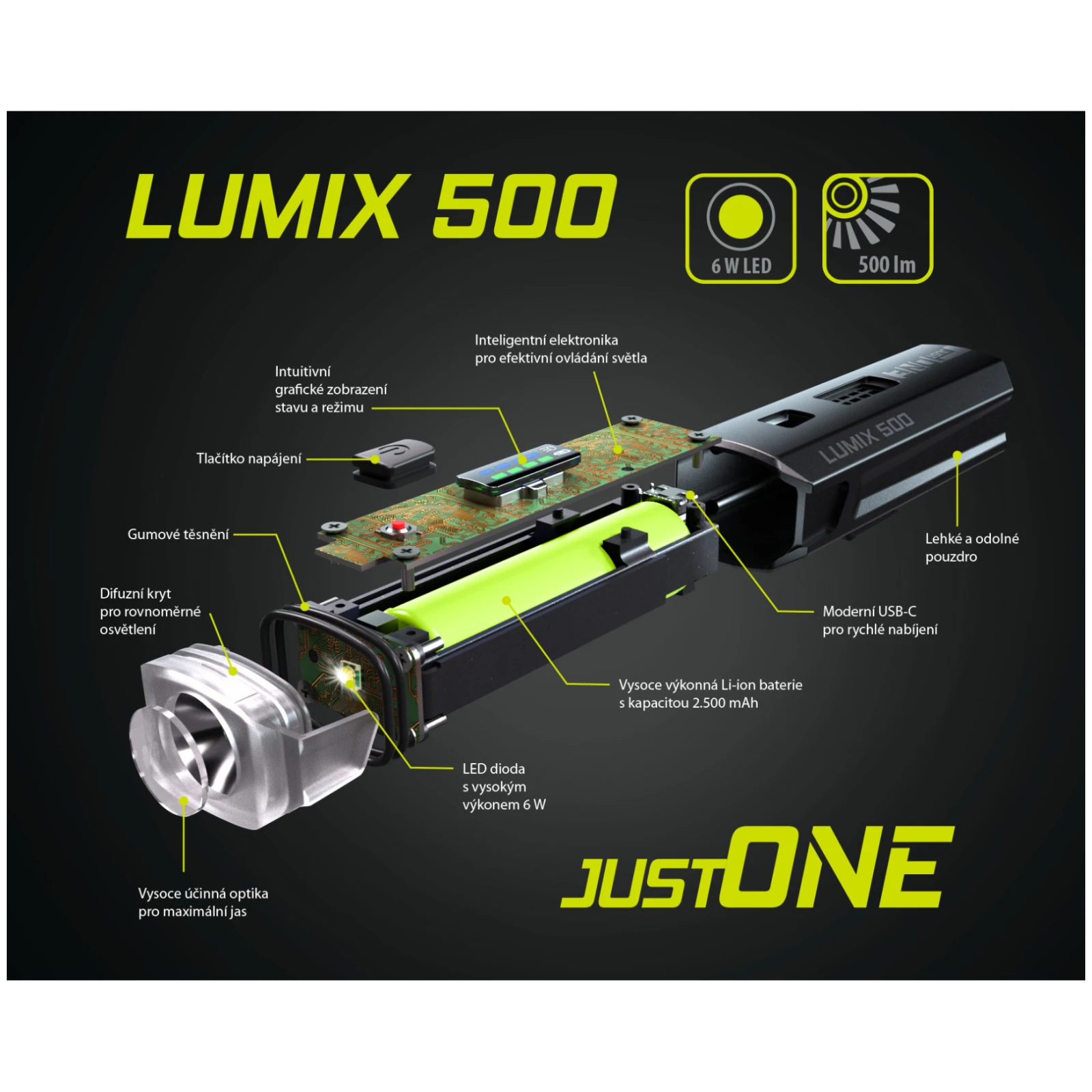 La luce anteriore Just One LUMIX 500 offre 3 intensità di illuminazione e lampeggio, visualizzazione grafica delle funzioni, struttura impermeabile IPX4 e un'autonomia fino a 13 ore.