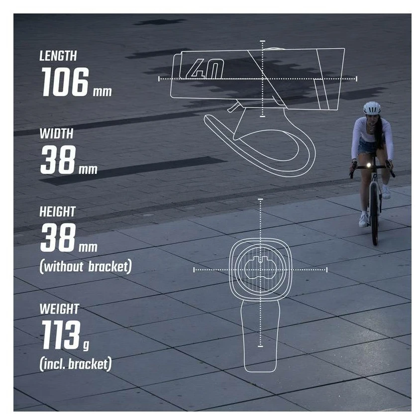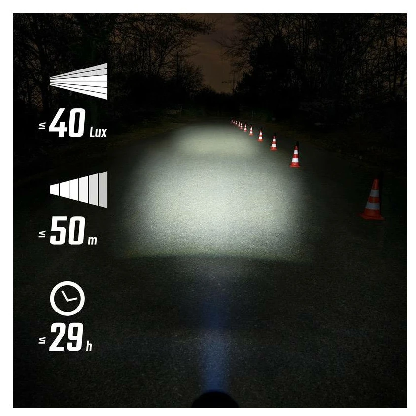 La luce offre un'intensità di 40 lux, una portata fino a 50 metri e una durata della batteria fino a 29 ore in modalità economica. Grazie alla batteria integrata con ricarica USB-C, si ricarica facilmente e velocemente, quindi è sempre pronta all'uso.