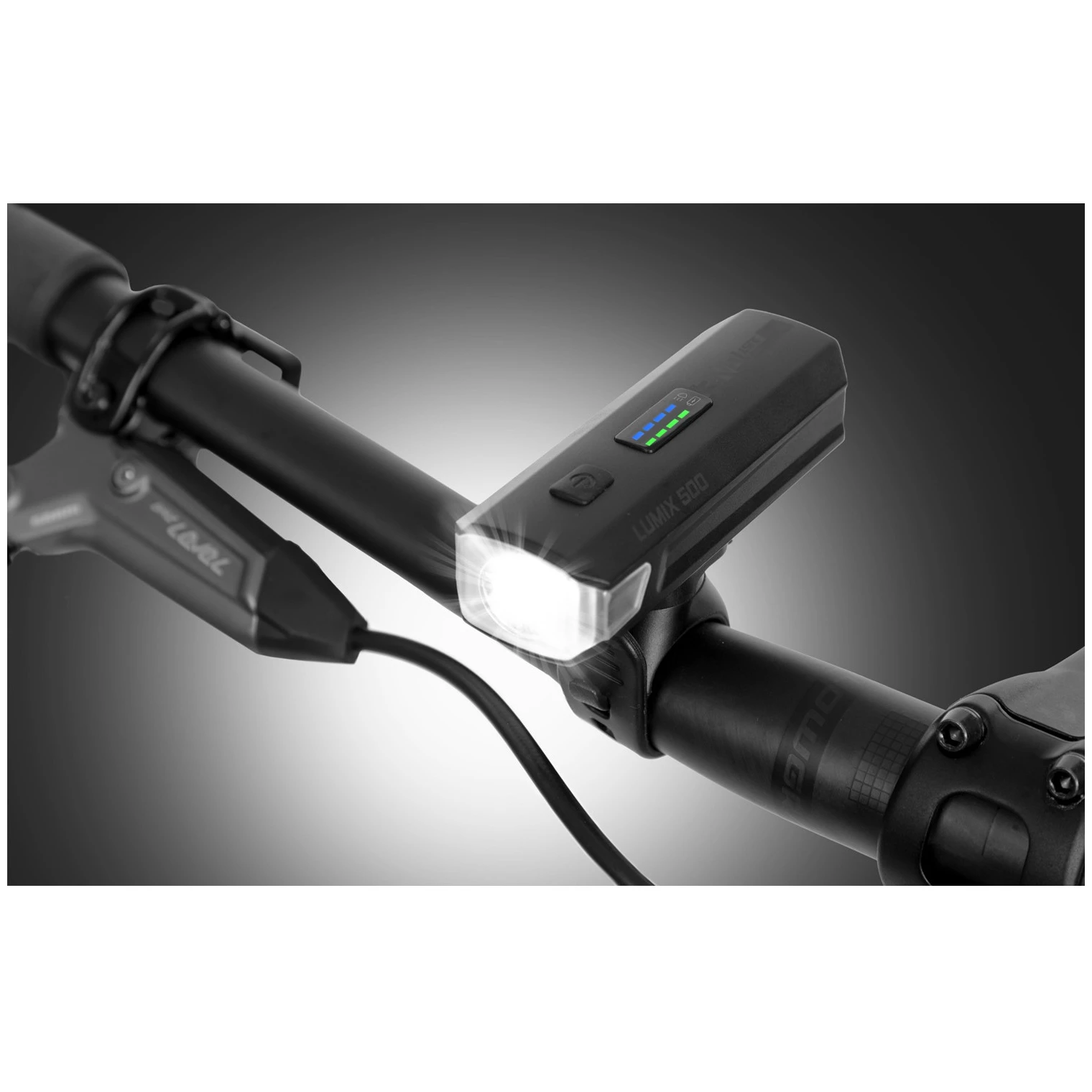La luce anteriore Lumix 500 offre una potenza di 500 lumen e una portata fino a 140 metri, illuminando perfettamente la strada davanti a te. È possibile scegliere tra quattro modalità di illuminazione (3 intensità + lampeggiante) in base alle condizioni attuali. Il display grafico integrato mostra chiaramente la modalità selezionata e lo stato della batteria. La luce è ricaricabile tramite USB-C, dotata di batteria Li-ion da 2500 mAh con un'autonomia fino a 13 ore e, grazie alla struttura impermeabile IPX4, è pronta anche per le uscite sotto la pioggia.