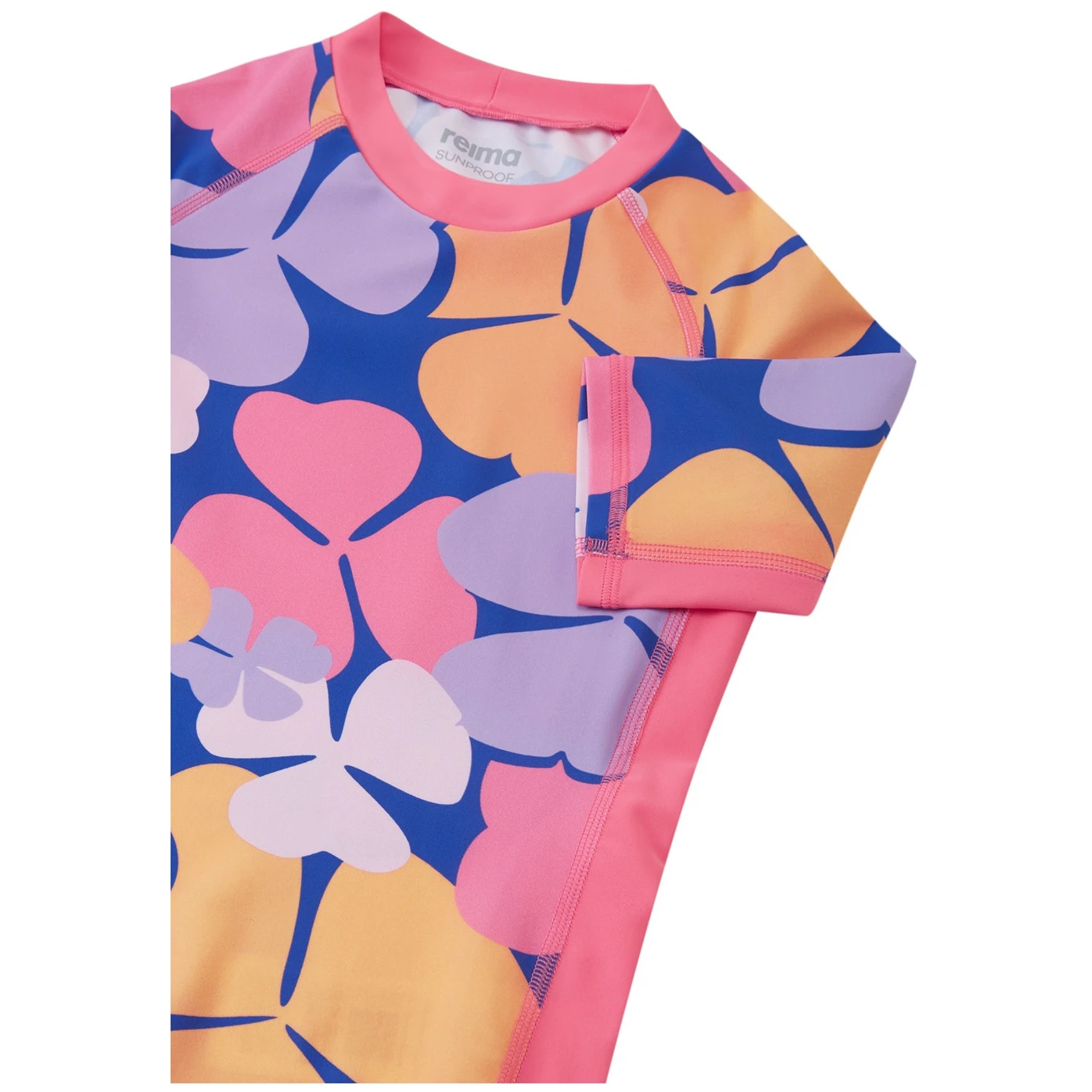 La maglietta Joonia per bambini del marchio Reima è progettata per movimenti sicuri e confortevoli al sole, in acqua e durante lo sport. È realizzata in morbido tessuto SunProof+ jersey, che contiene l'80% di poliammide riciclato e il 20% di elastan, rendendo la maglietta leggera, elastica e piacevole al tatto. Il materiale offre una protezione UV 50+ secondo la norma EN 13758-1 +A1 e protegge la pelle dai raggi UVA e UVB.