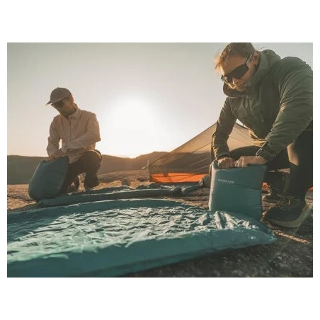 La superficie è realizzata in nylon molto resistente con trattamento ripstop e laminazione TPU. L'isolamento a triplo strato fornisce un eccellente rapporto calore-peso. Grazie all'aumentato numero di piccole camere d'aria, il materassino si adatta perfettamente al corpo e allo stesso tempo gli fornisce un supporto e una stabilità sufficienti. Il materiale è molto piacevole al tatto. La valvola Peak Valve efficiente aiuta al rapido gonfiaggio con l'aiuto del sacco di gonfiaggio, che è incluso nella confezione.