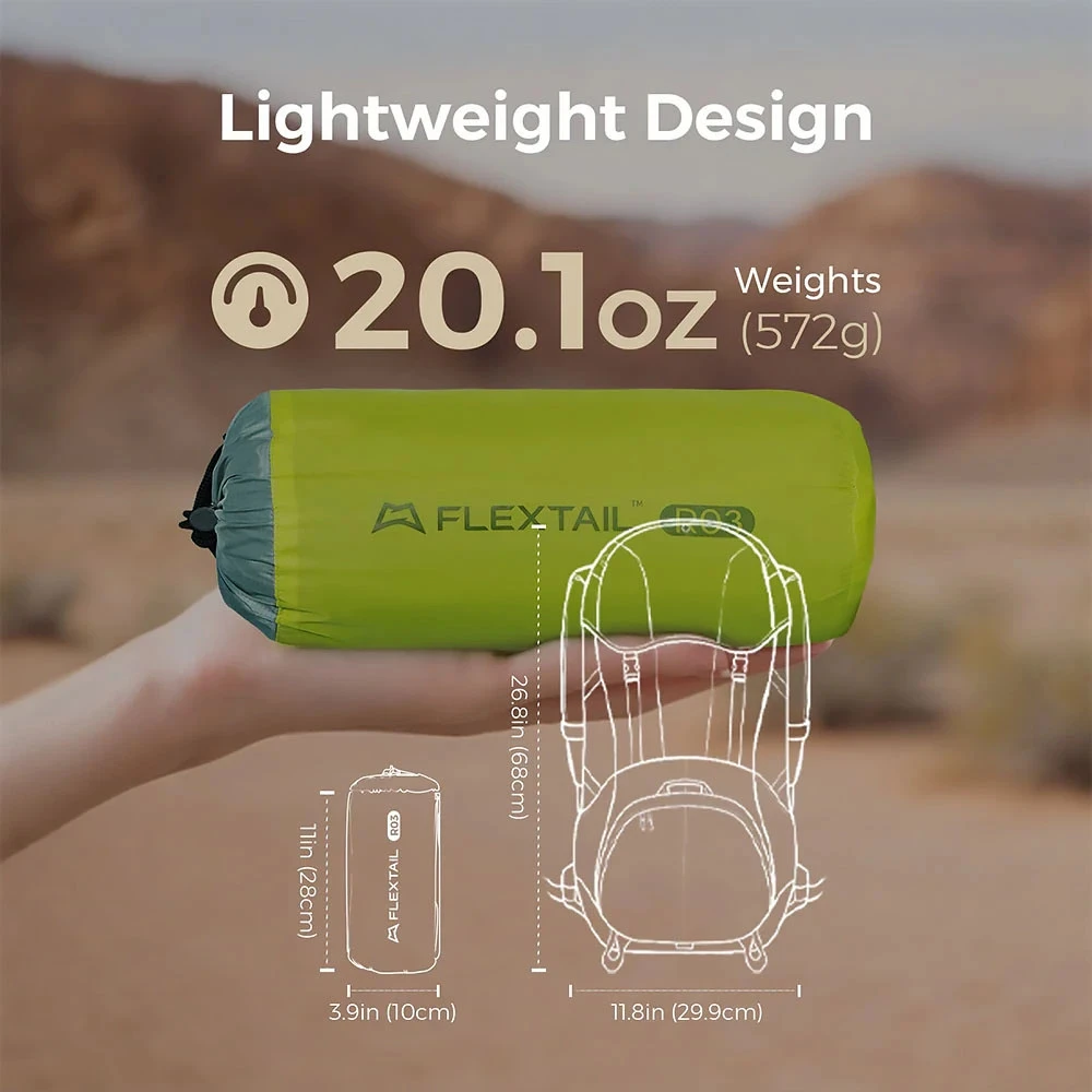 TINY Sleeping Pad R03 AVS di Flextail è un moderno materassino da campeggio a tre stagioni che combina una struttura ultraleggera, un eccellente isolamento e una pompa a batteria integrata per il massimo comfort in viaggio. Pesa solo 572 g e da chiuso misura 11 × 28 cm: si ripone facilmente nello zaino, ma offre un sonno completo anche in condizioni difficili. Grazie alla pompa ad aria integrata, gonfierai il materassino in 90 secondi – e senza dover soffiare con la bocca