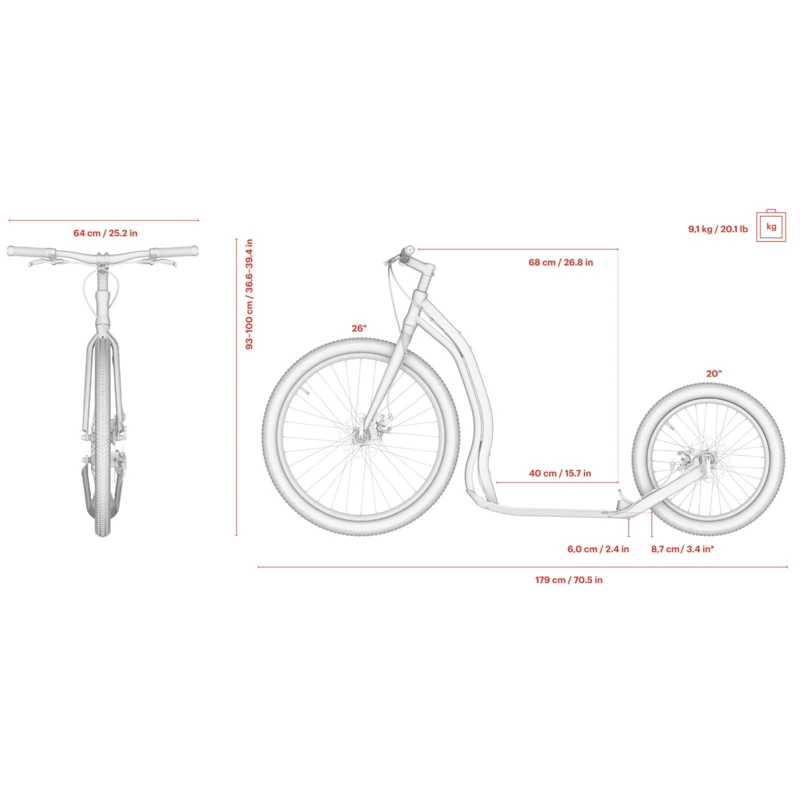 Il telaio in alluminio rinforzato con ampie pedane è progettato per le discese adrenaliniche, il mushing e il fuoristrada. Con un peso di 9,2 kg, lo scooter ha una capacità di carico massima di 150 kg. I freni a disco si innestano rapidamente e sono molto efficaci in tutte le condizioni atmosferiche: bagnato, fango e foglie cadute.