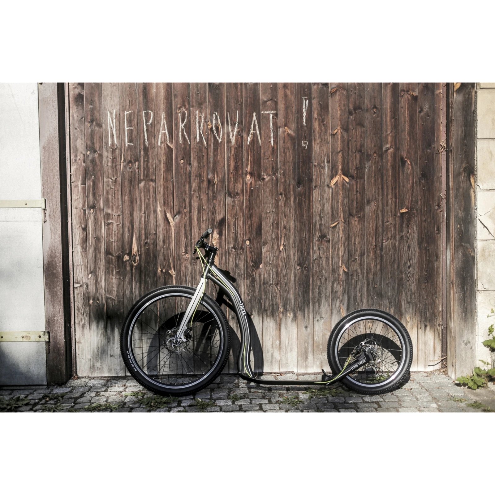 Il manubrio oversize e i corrimano con raster antiscivolo conferiscono al pilota un senso di stabilità. Grazie alle leve a sgancio rapido sulla parte anteriore e posteriore, è possibile rimuovere entrambe le ruote in pochi secondi, trasportare facilmente lo scooter in auto o riporlo a casa. Il modello è pronto per il montaggio di un cavalletto, di parafanghi e di due portaborracce; è possibile acquistare questi e altri accessori come una luce, un campanello, un portacellulare, una borsa o un set da mushing