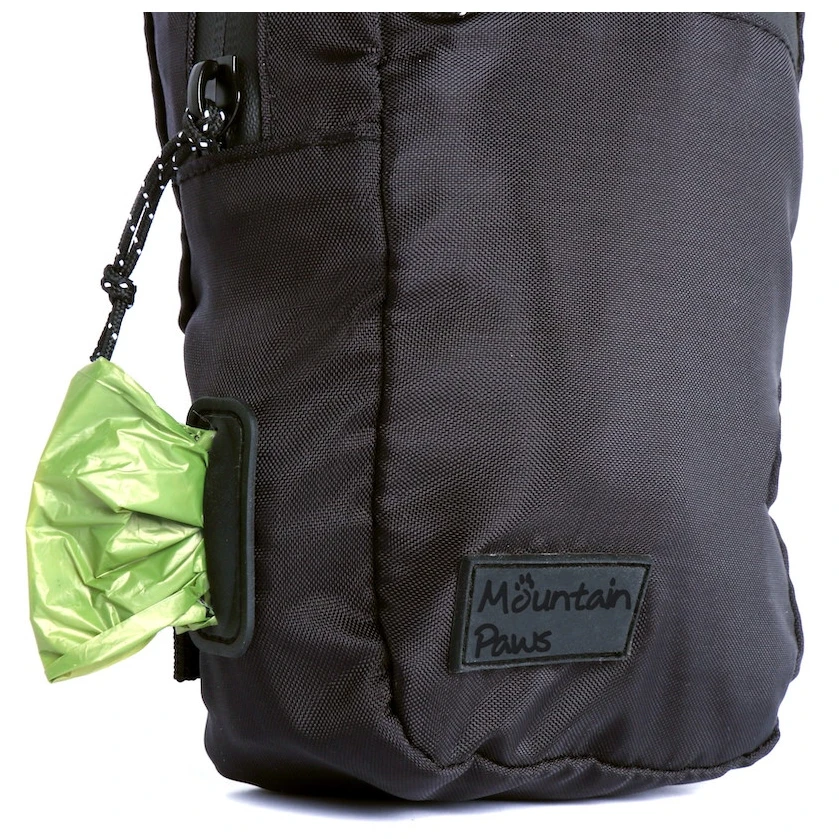 Il porta snack è realizzato in resistente materiale impermeabile, compresa la zip. Oltre allo scomparto principale per gli snack, è disponibile anche una tasca per il cellulare e una tasca frontale con zip per altre piccole attrezzature. Ovviamente c'è una tasca con dispenser per i sacchetti per gli escrementi.
