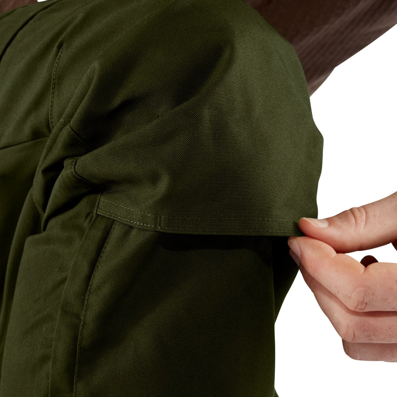Per la regolazione della temperatura, sono presenti aperture di ventilazione con zip dai fianchi alle ginocchia e lungo i polpacci, il che è pratico durante le attività più intense sul campo. I pantaloni offrono diverse opzioni di stoccaggio: due ampie tasche sulle gambe (quella sinistra con tasca interna in rete per telefono o ricetrasmittente e zip per riporre gli oggetti in sicurezza), una tasca per coltello e due tasche per le mani.