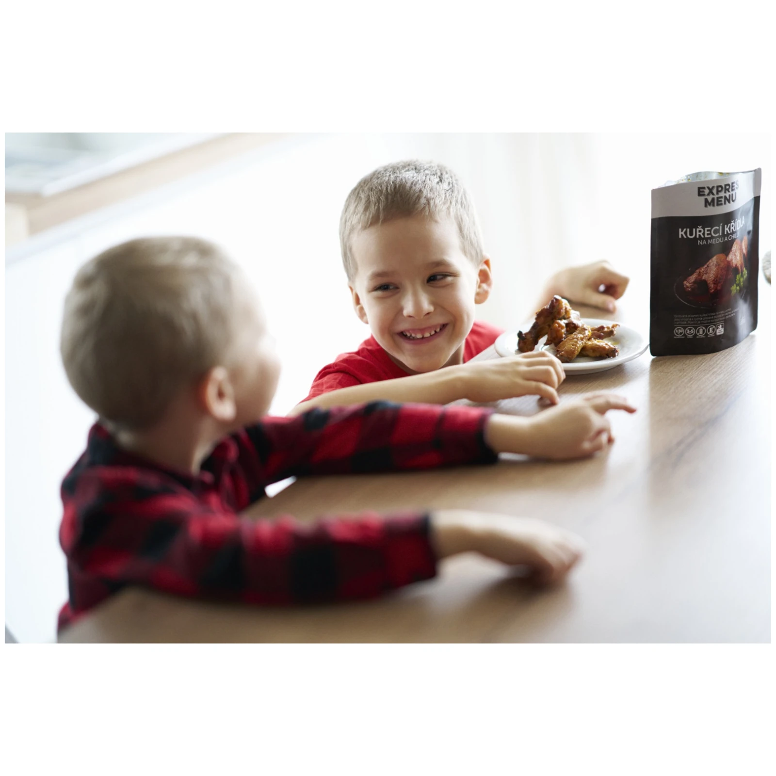 Se avete bisogno di preparare velocemente diverse porzioni di cibo, questo piatto del Expres menu - Ali di pollo con miele e peperoncino è quello che fa per voi. Questo piatto può essere consumato anche freddo. Per accompagnare le ali di pollo si può anche preparare un gustoso riso, offerto anche da questa azienda. In questo modo è facile preparare un pasto completo in pochi minuti.
