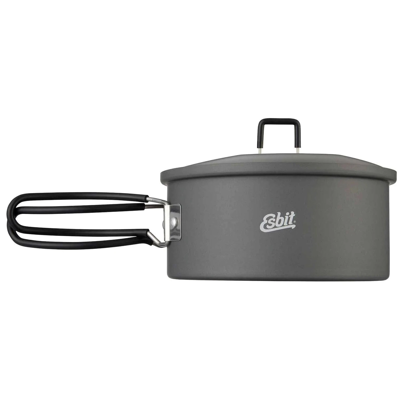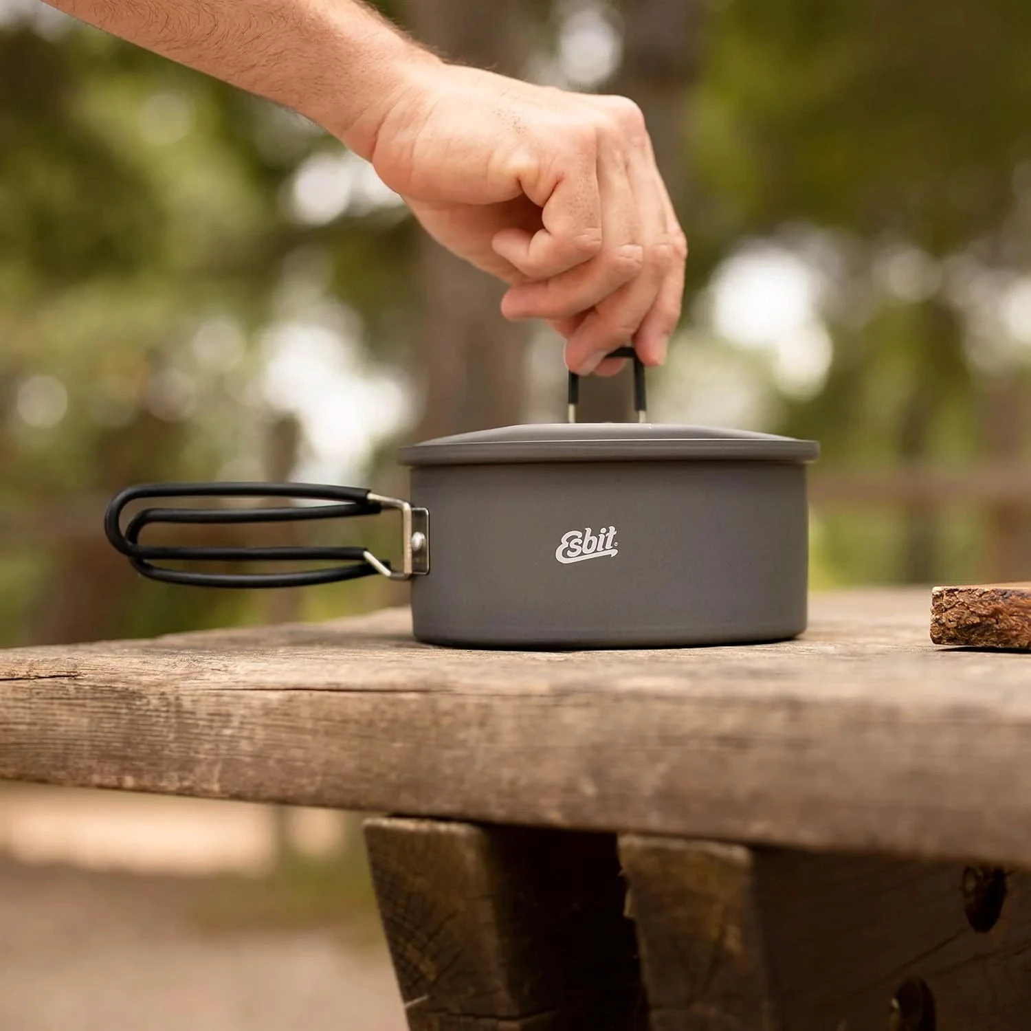 La pentola da campeggio rotonda Esbit è resistente al calore, ha un manico pieghevole in acciaio inossidabile con rivestimento in silicone che garantisce una presa comoda.